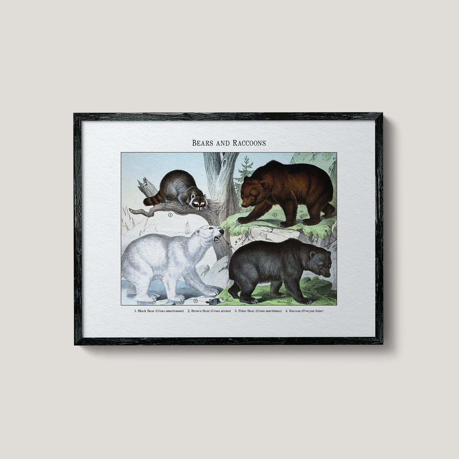 Restored from a 19th-century plate, this vintage scientific illustration brings together the great bears—Black Bear (Ursus americanus), Brown Bear (Ursus arctos), and Polar Bear (Ursus maritimus)—with their nimble cousin, the Raccoon (Procyon lotor), arranged across rocky forest ledges and an Arctic shoreline. The restoration preserves period character while reviving fine linework and color, making it a striking natural history art print for study or display.
