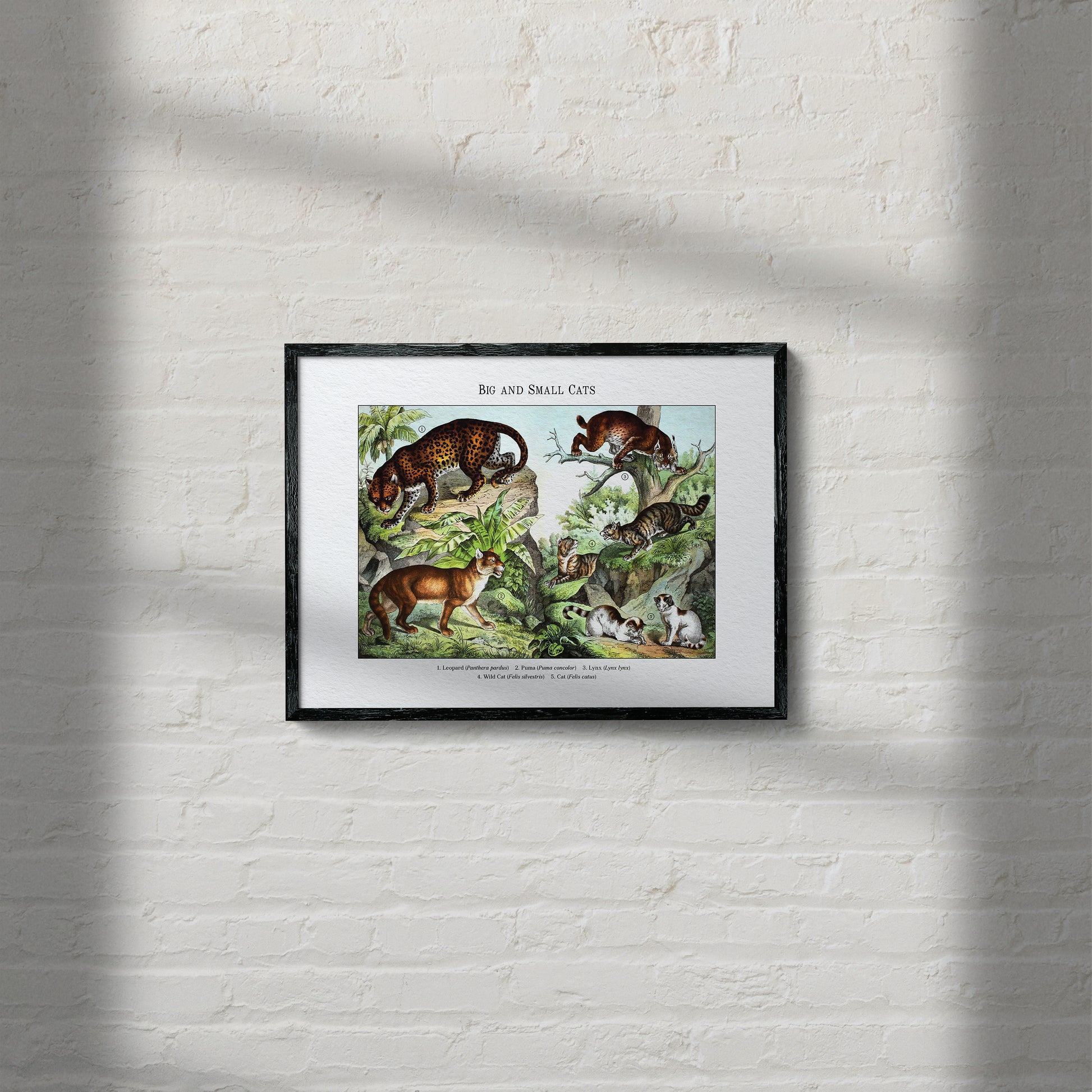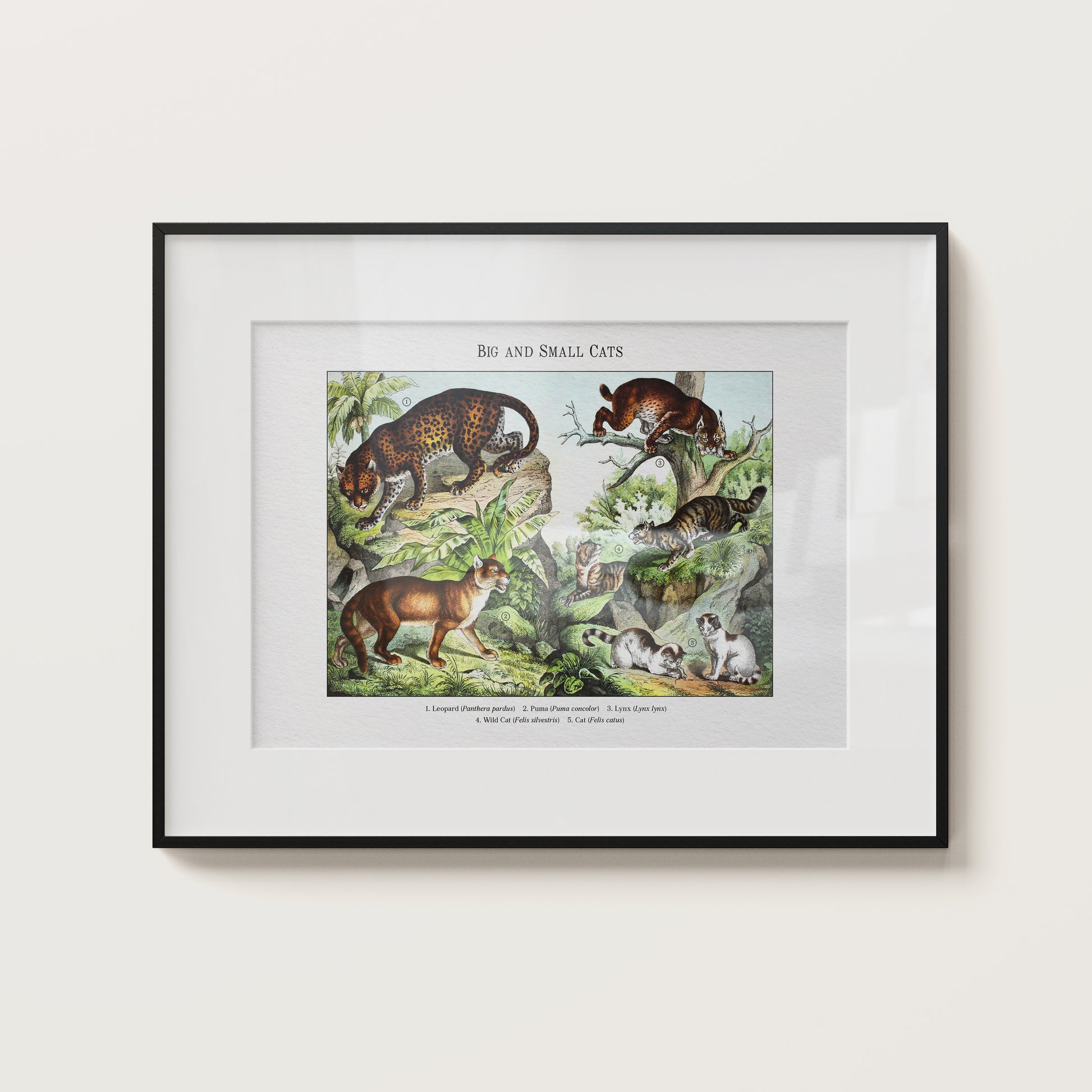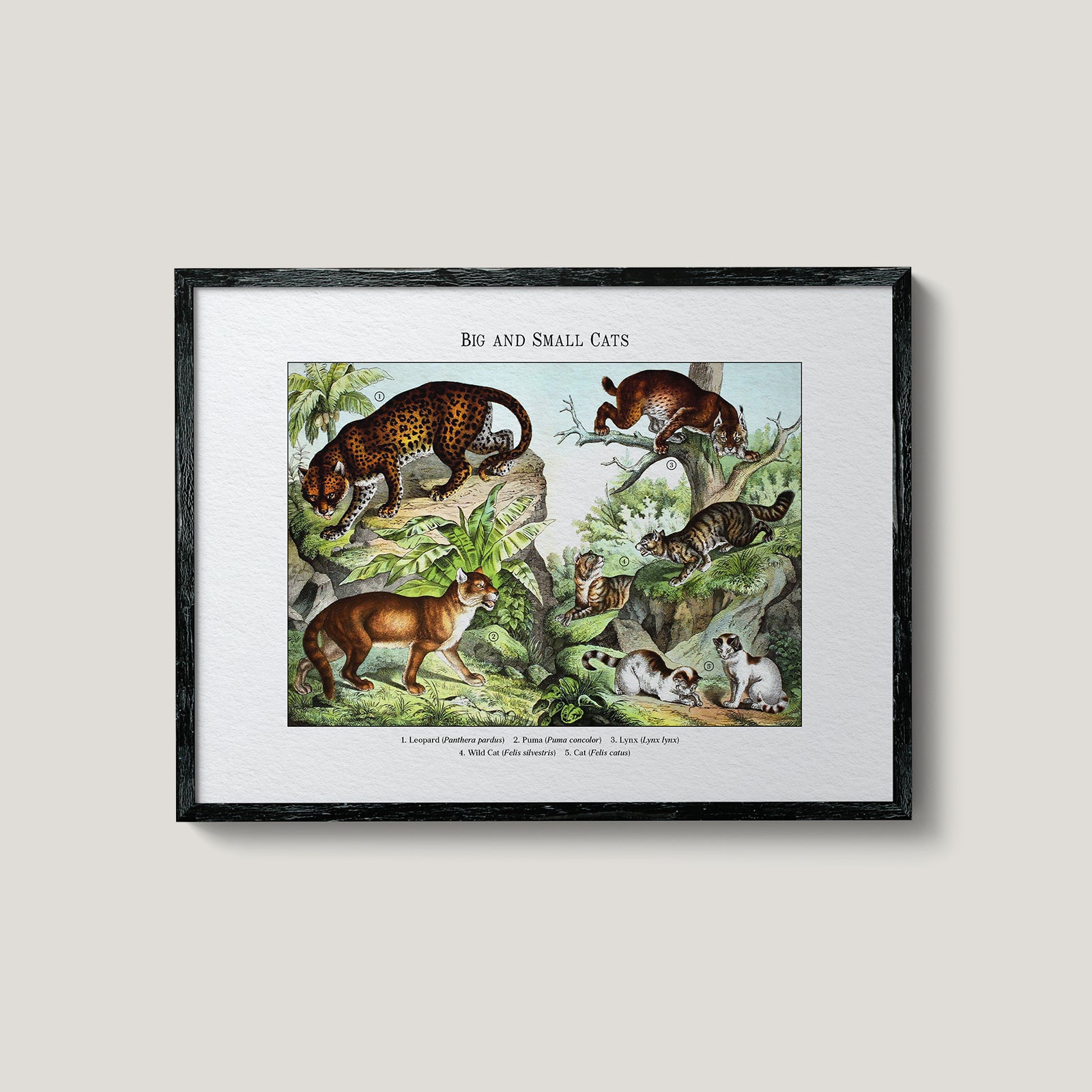 Restored from a 19th-century plate, this vintage scientific illustration gathers the big and small cats—Leopard (Panthera pardus), Puma (Puma concolor), Lynx (Lynx lynx), Wild Cat (Felis silvestris), and Cat (Felis catus)—poised on rocky ledges and tree branches across tropical and temperate scenes. The restoration preserves period character while reviving fine linework and color, making it a striking natural history art print for study or display.