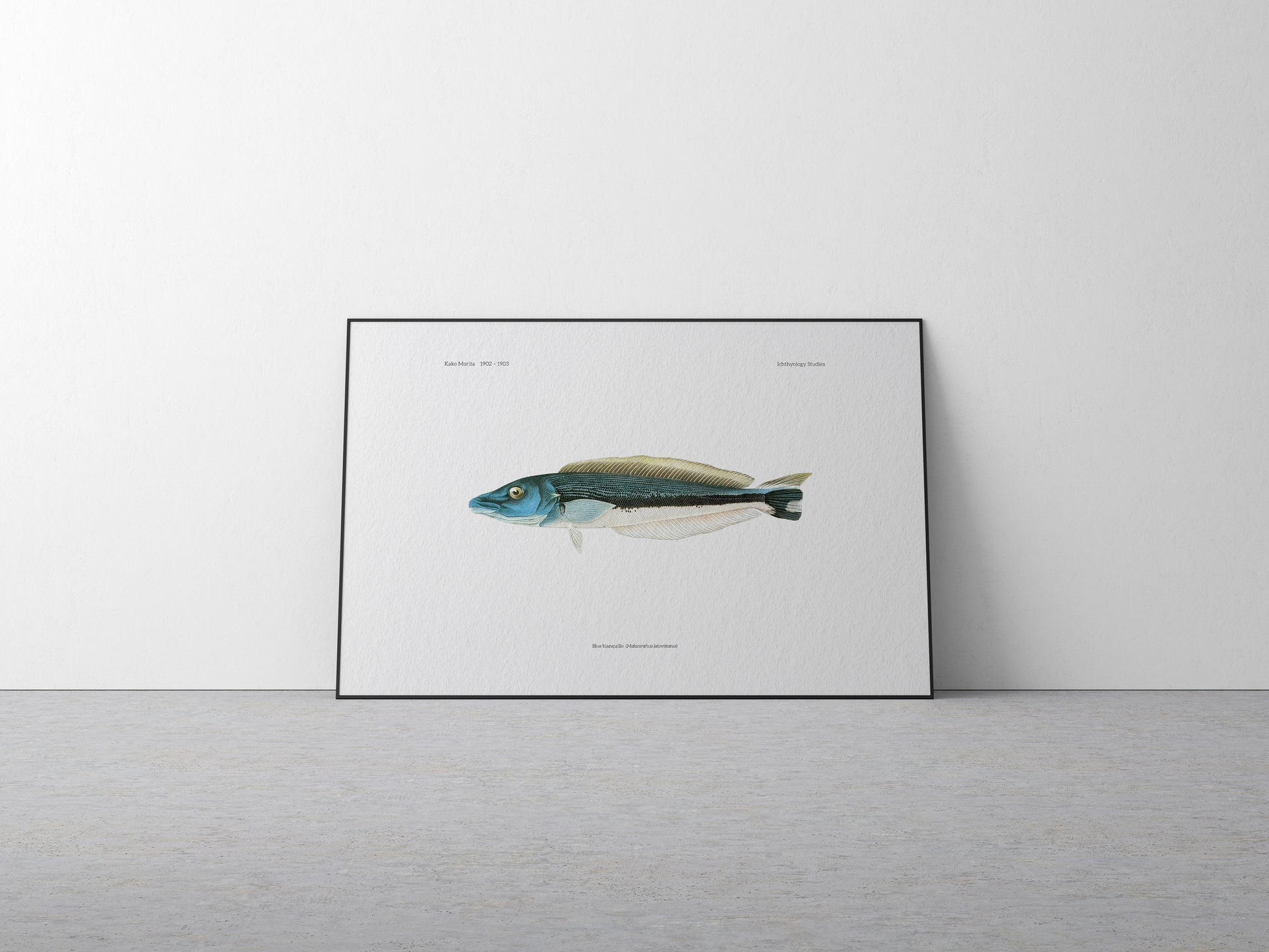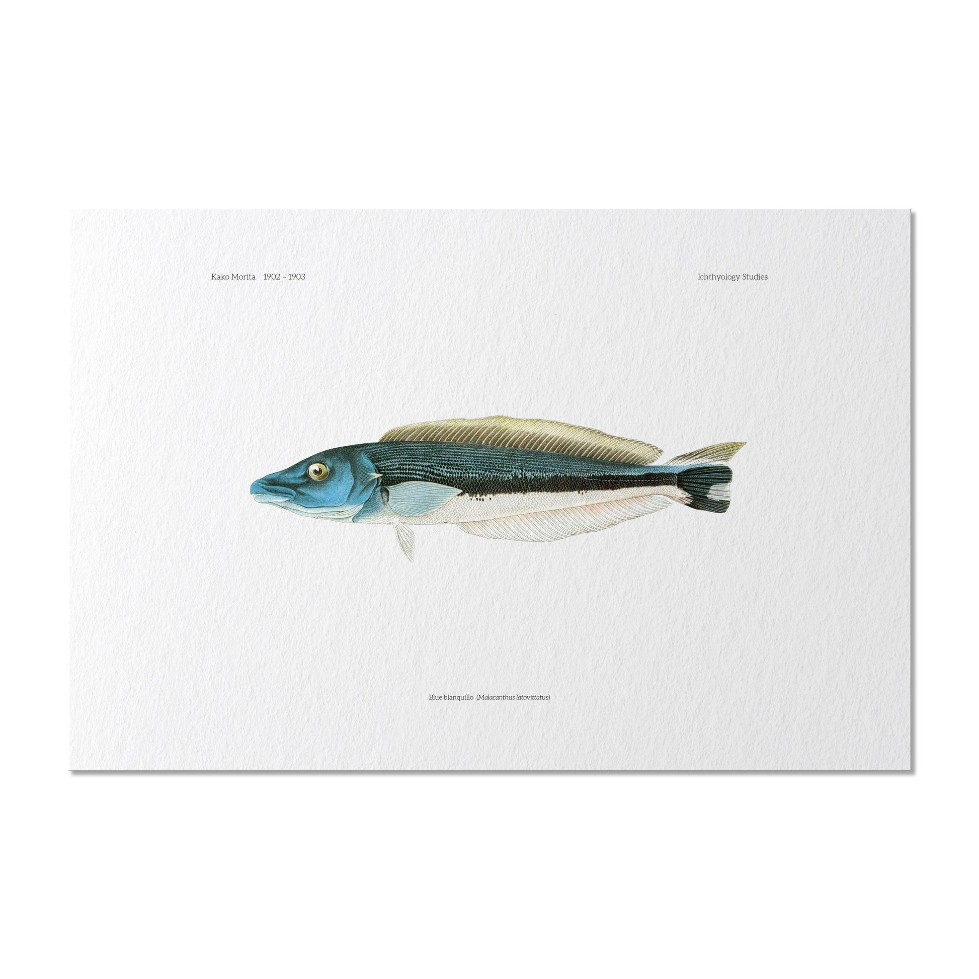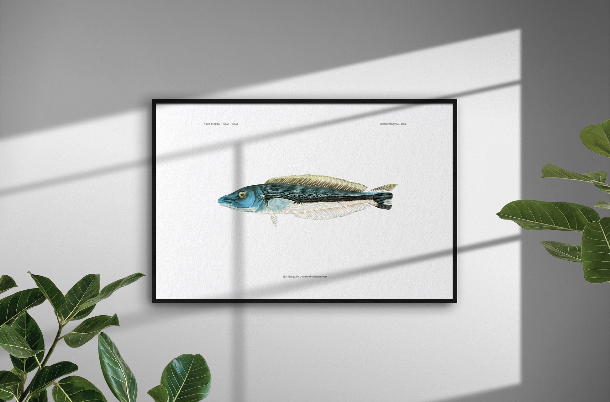 Restored from an early 20th-century plate, this vintage scientific illustration presents a single reef fish—the Blue blanquillo (Malacanthus latovittatus)—shown in full profile with its elongated body, fine dorsal fin, and soft blue-grey tones against a spacious white ground. The restoration preserves the quiet period typography while reviving fine linework and luminous color, making it a refined natural history art print for coastal interiors, studios, or ichthyology lovers.
