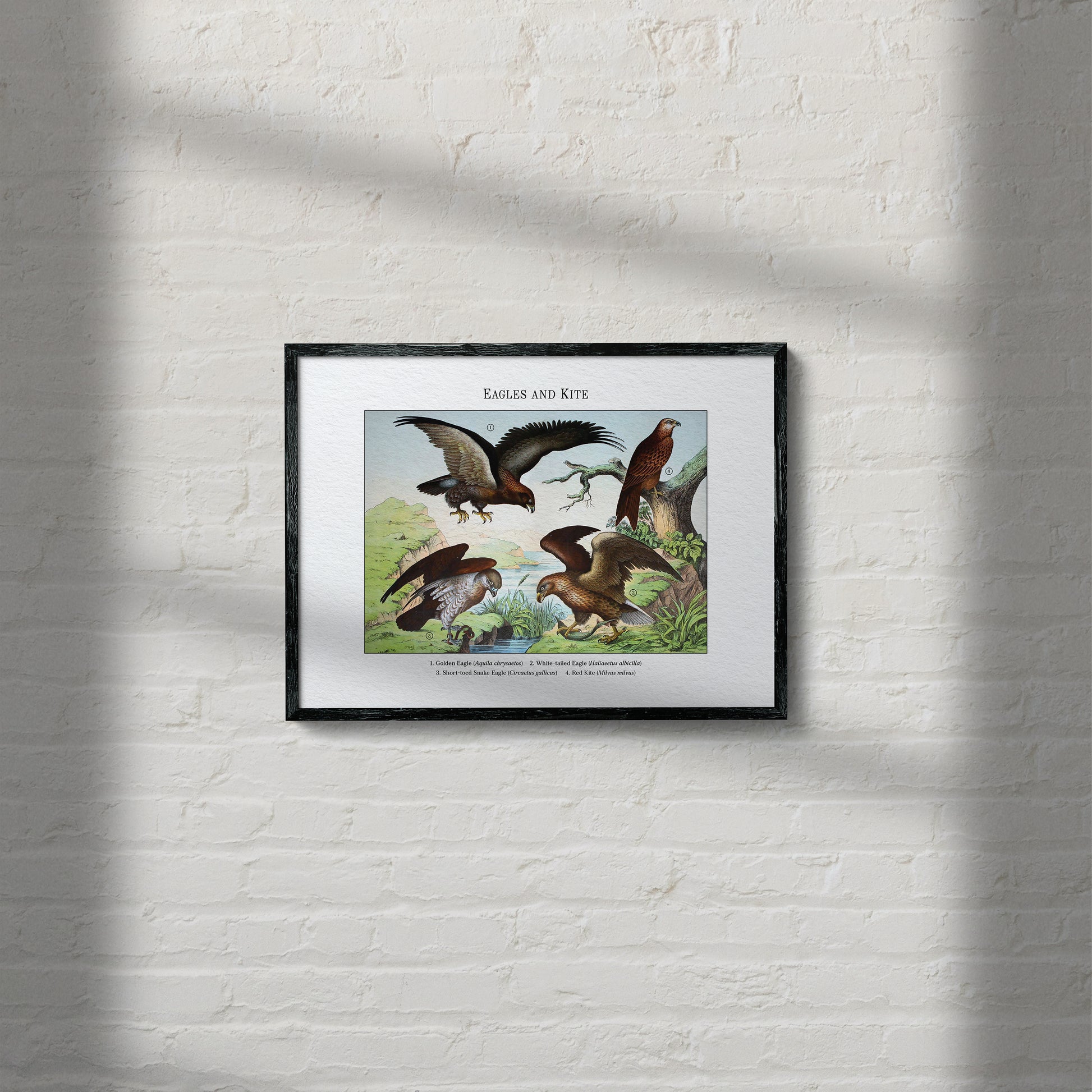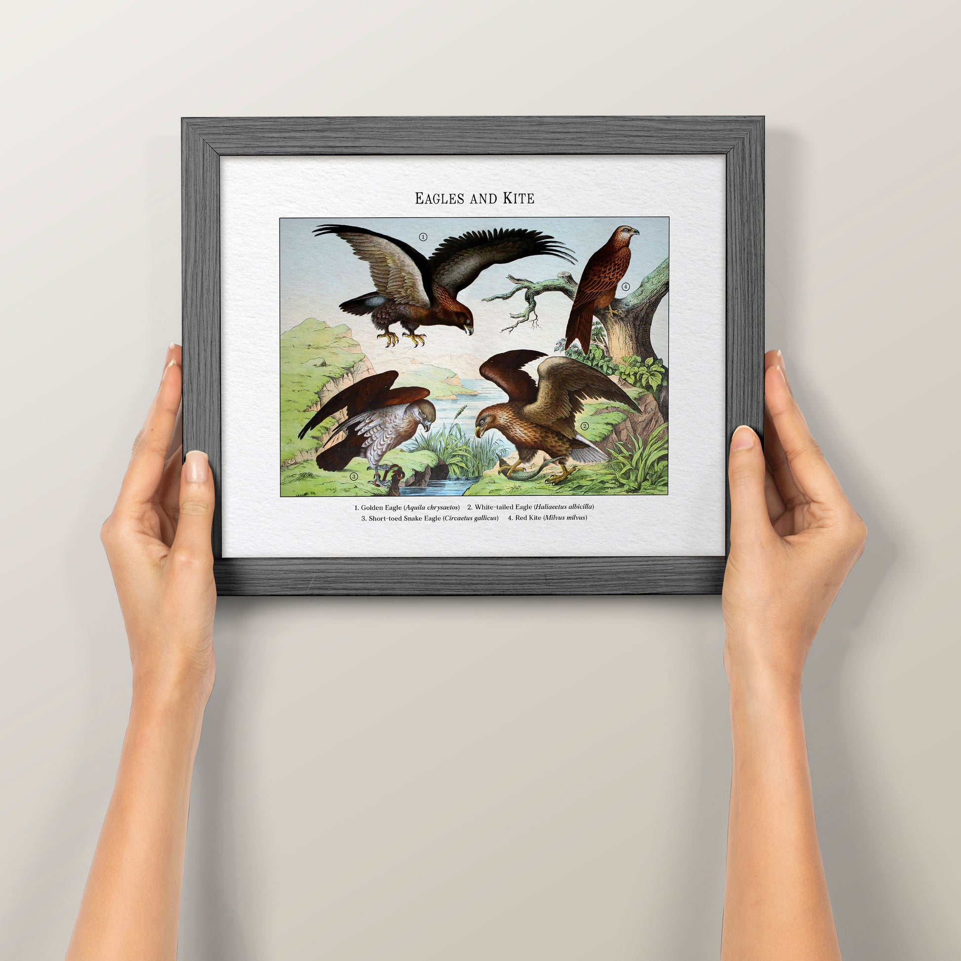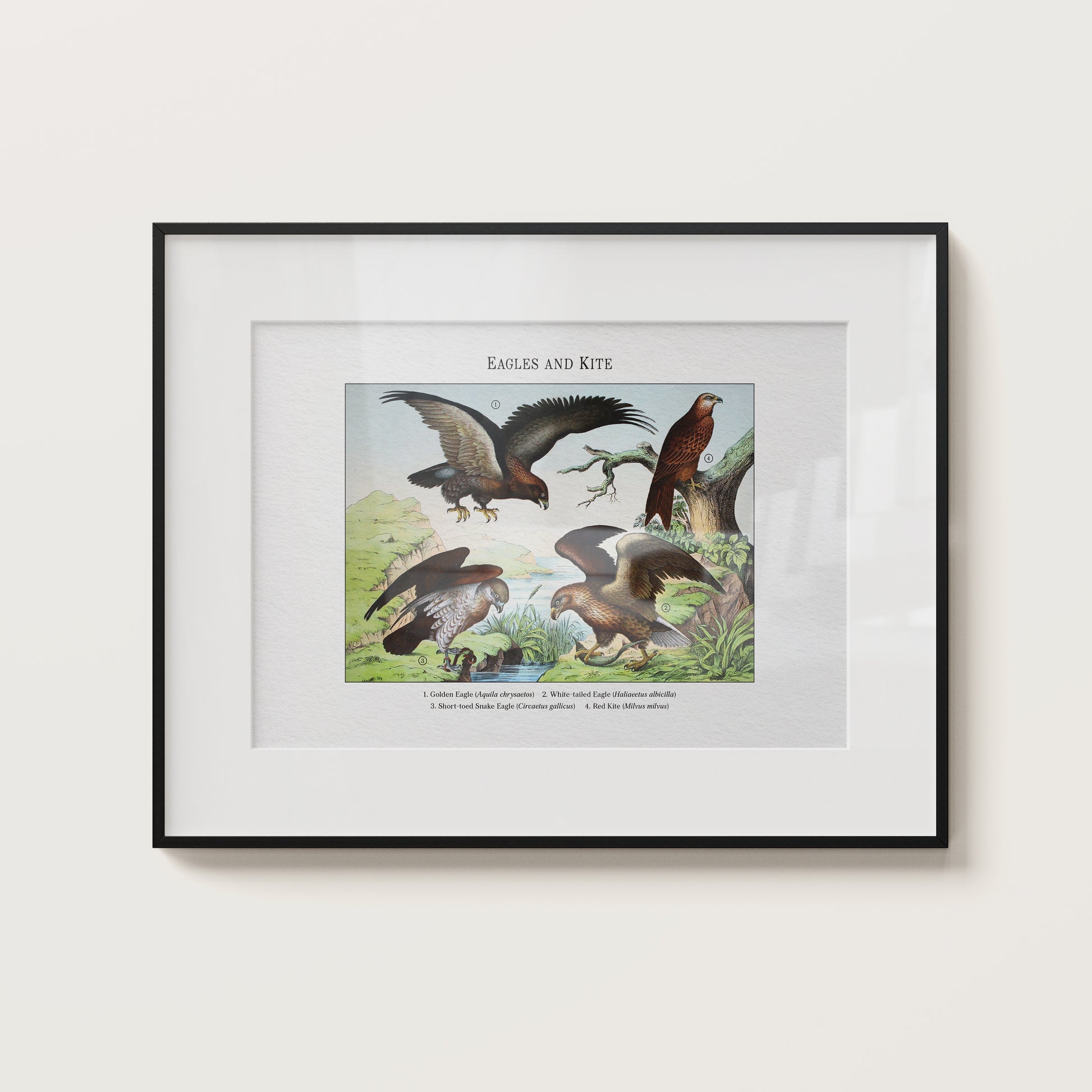 Restored from a 19th-century plate, this vintage scientific illustration gathers eagles and kite—the Golden Eagle (Aquila chrysaetos), White-tailed Eagle (Haliaeetus albicilla), Short-toed Snake Eagle (Circaetus gallicus), and Red Kite (Milvus milvus)—poised over a rocky river valley with wings spread and talons ready. The restoration preserves period character while reviving fine linework and color, making it a striking natural history art print for study or display.