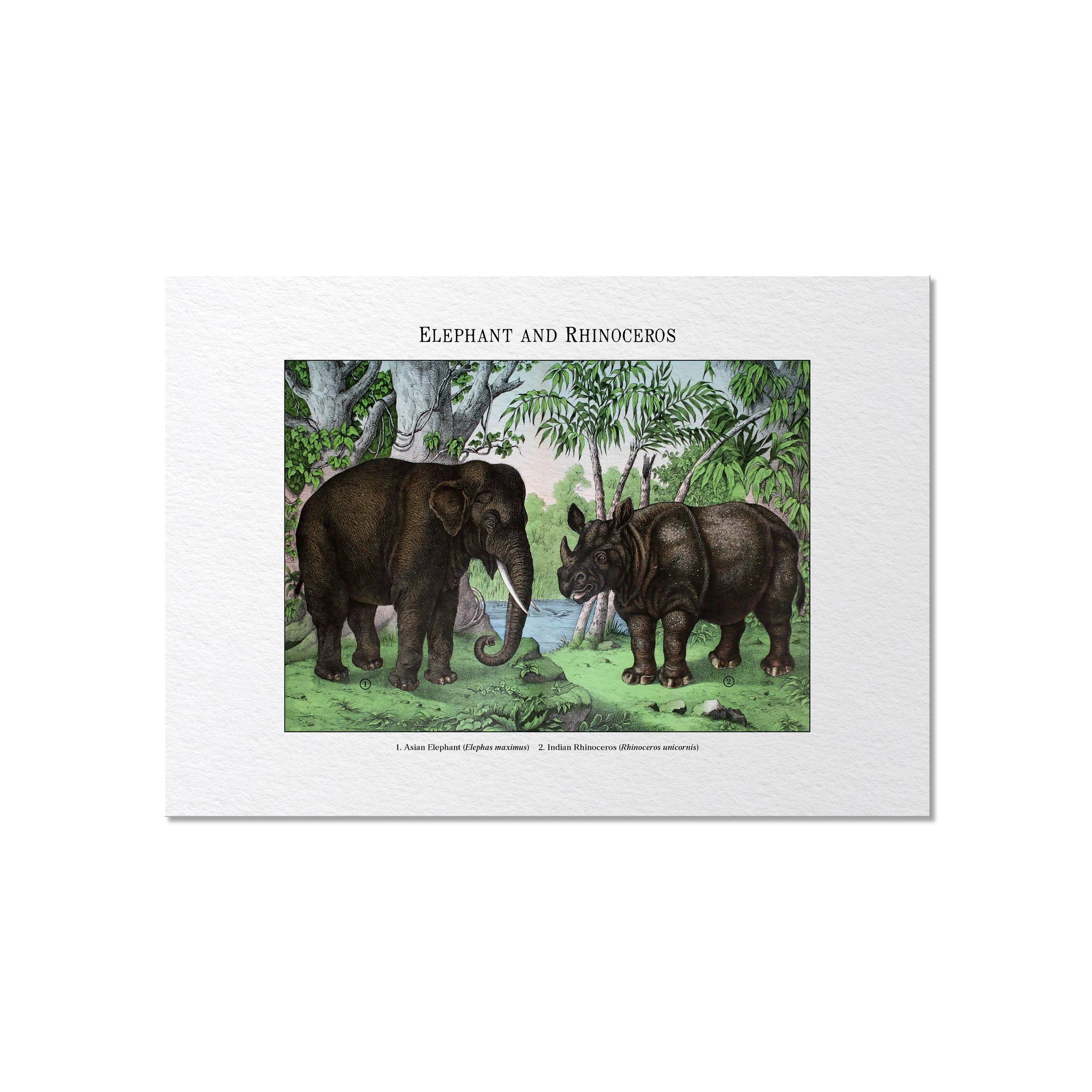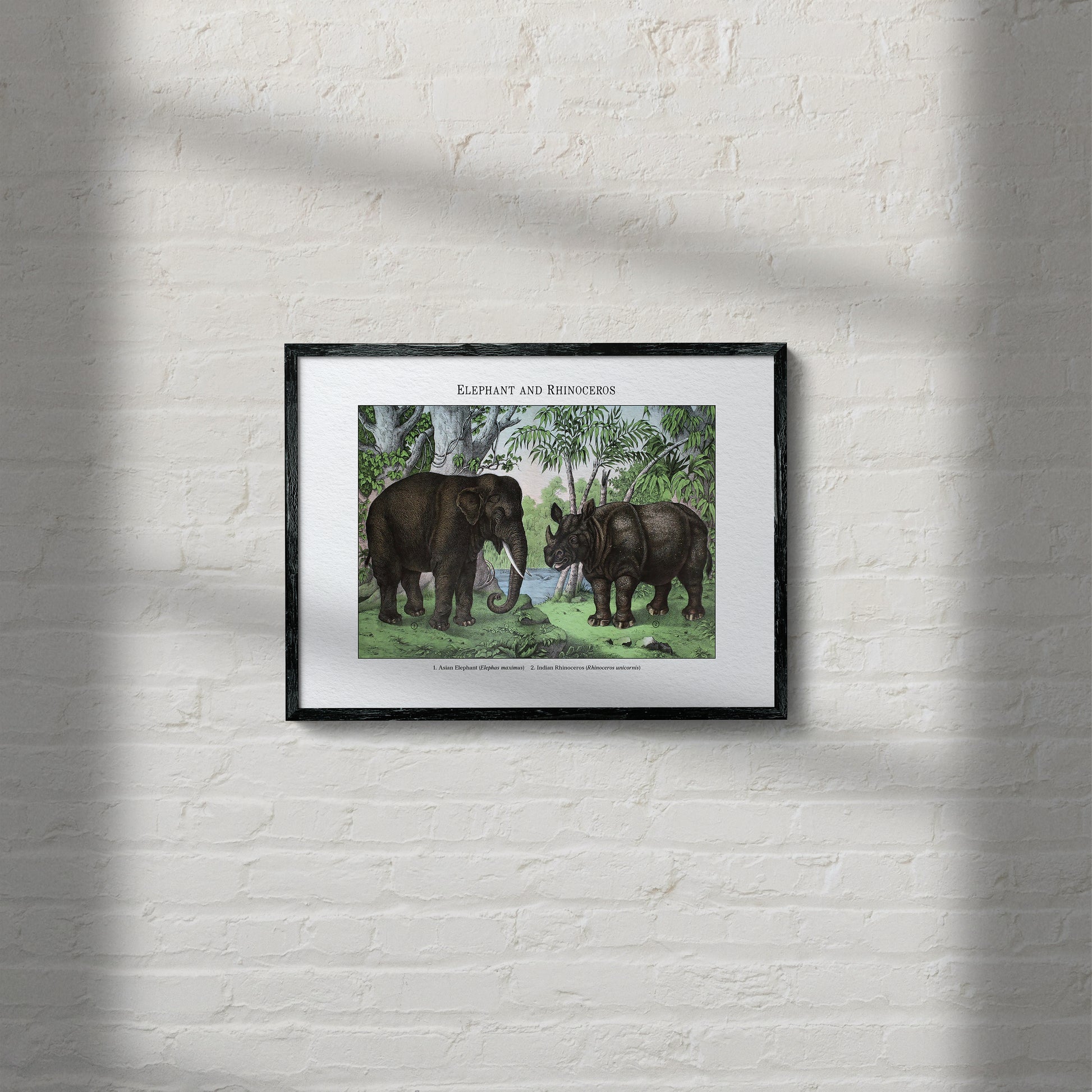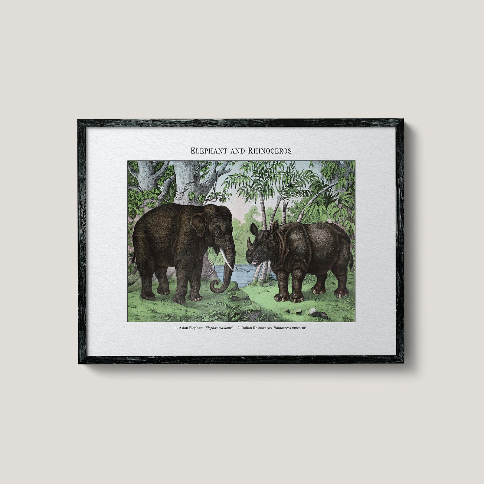 Restored from a 19th-century plate, this vintage scientific illustration pairs the Asian Elephant (Elephas maximus) and the Indian Rhinoceros (Rhinoceros unicornis) in a lush jungle scene. The restoration preserves period character while bringing back fine linework and color, making it a striking natural history art print for study or display.
