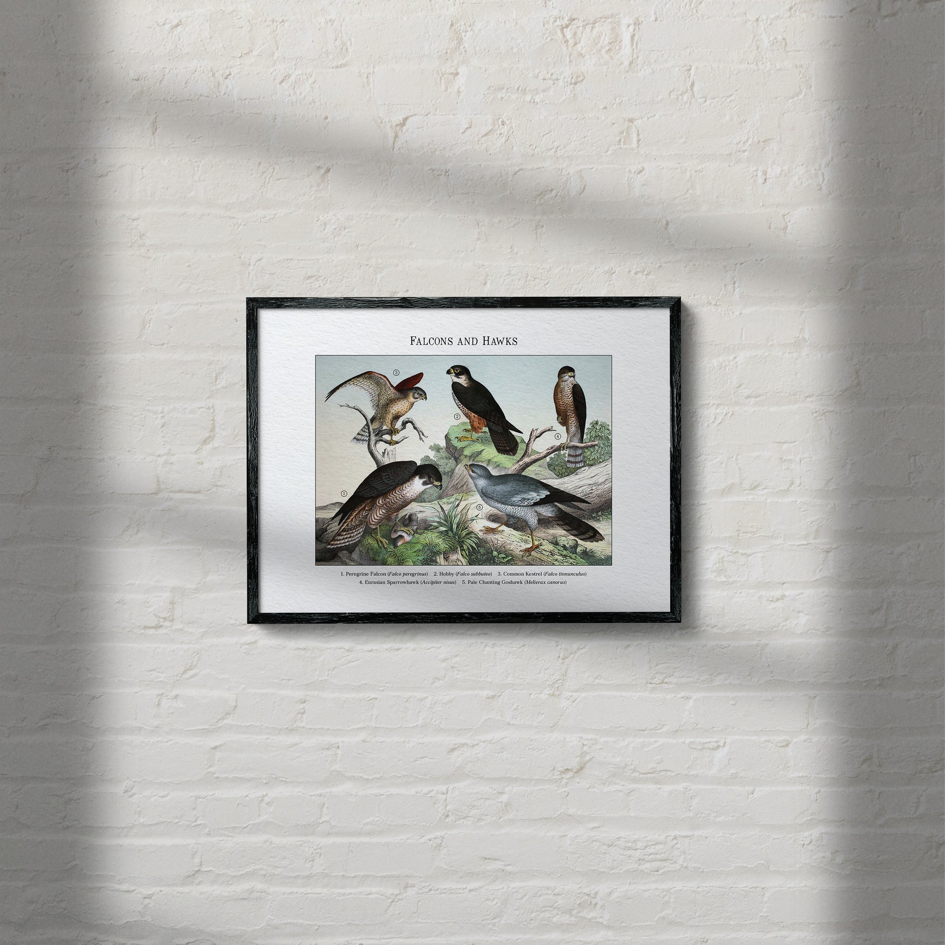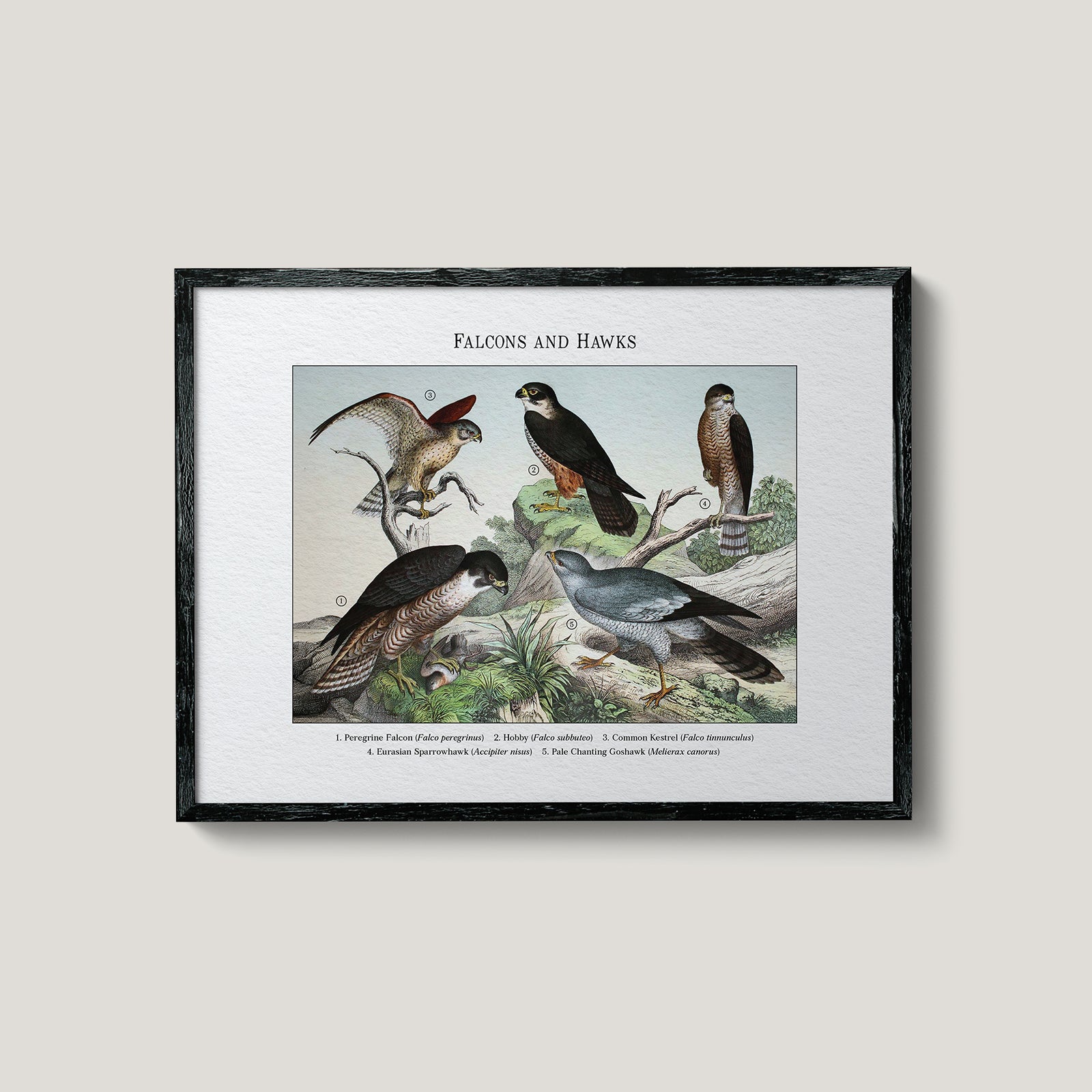 Restored from a 19th-century plate, this vintage scientific illustration gathers falcons and hawks—the Peregrine Falcon (Falco peregrinus), Hobby (Falco subbuteo), Common Kestrel (Falco tinnunculus), Eurasian Sparrowhawk (Accipiter nisus), and Pale Chanting Goshawk (Melierax canorus)—poised on wind-gnarled branches and rocky ledges above a valley. The restoration preserves period character while reviving fine linework and color, making it a striking natural history art print for study or display.