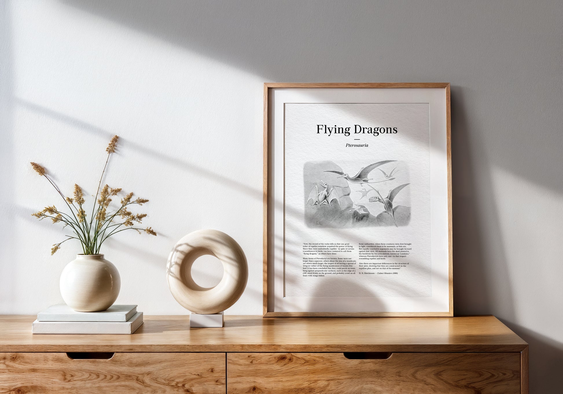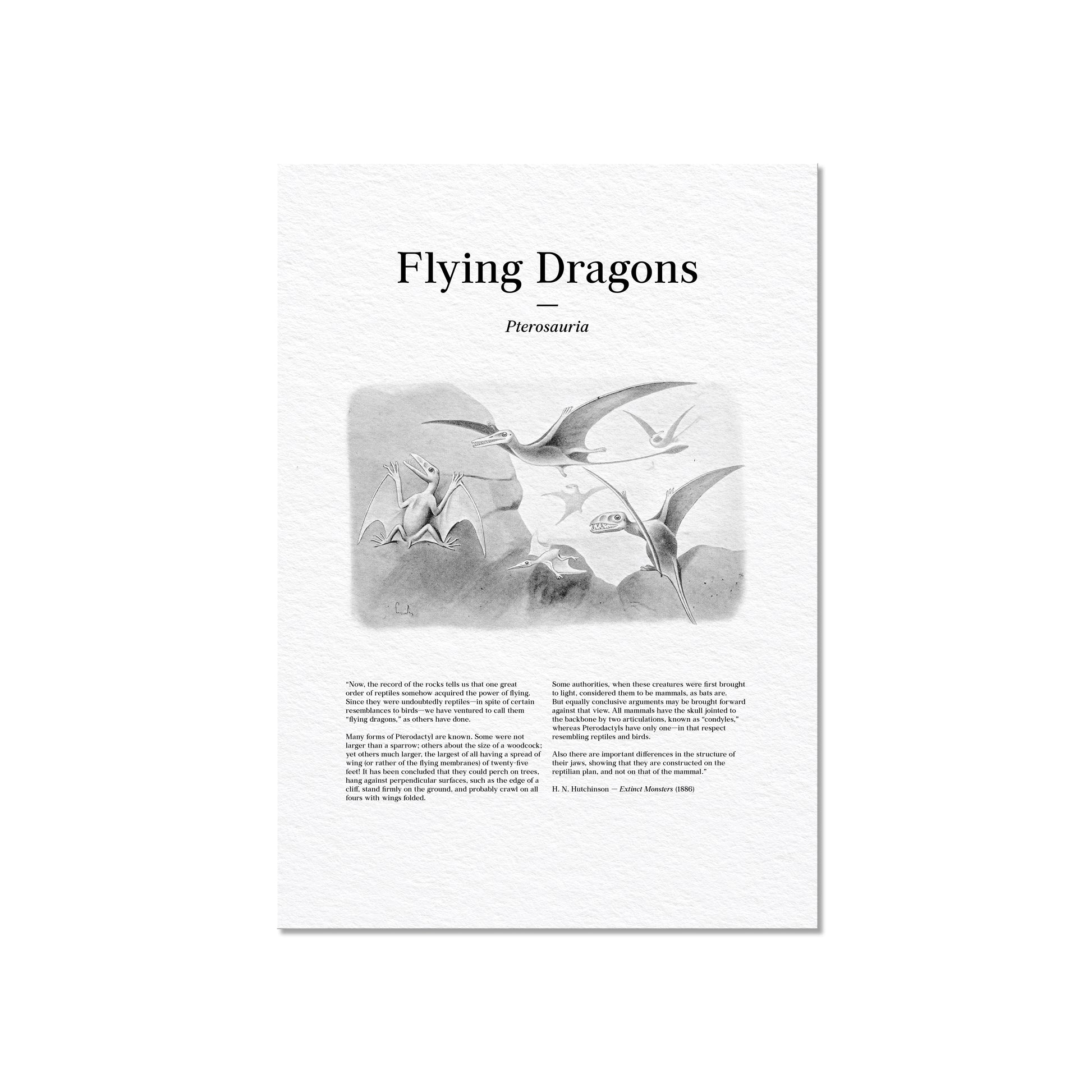 Restored from a late 19th-century scientific plate, this vintage illustration depicts prehistoric flying reptiles, commonly known as “flying dragons,” or pterosaurs (Pterosauria), shown soaring and clinging to rocky cliffs in a dramatic aerial scene. Multiple forms are presented in flight and at rest, emphasizing elongated wings, slender bodies, and beak-like jaws as understood by Victorian paleontologists. Designed to evoke the appearance of an illustrated newspaper or popular science journal, the print incorporates original text reproduced from Extinct Monsters: A Popular Account of Some of the Larger Forms of Ancient Animal Life by Henry Neville Hutchinson, where these illustrations were first published in 1886. Carefully restored to preserve period typography, engraved shading, and atmospheric composition, this artwork blends early paleontological imagery with authentic historical text, resulting in a distinctive natural history print with a deliberate newspaper-style presentation.