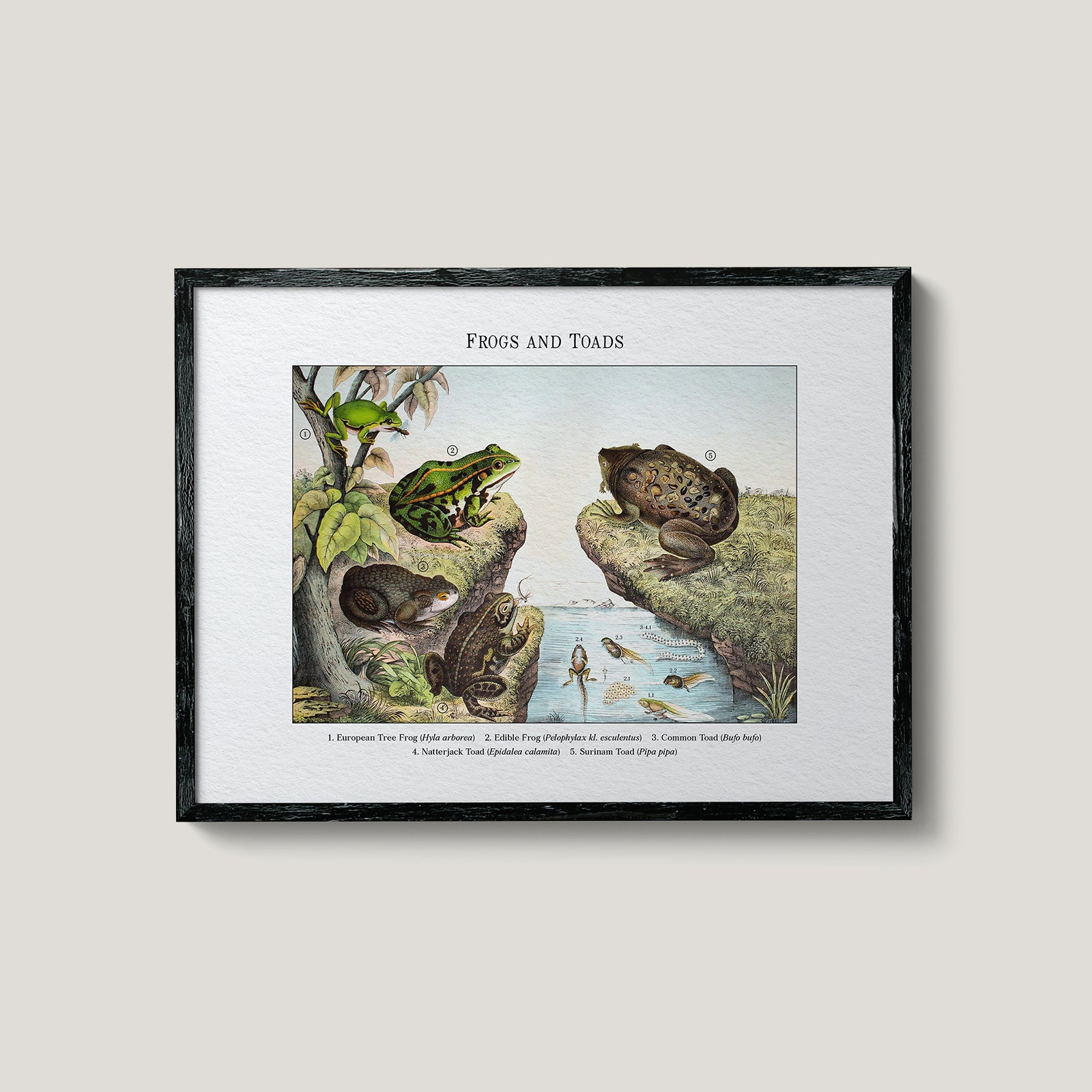 Restored from a 19th-century plate, this vintage scientific illustration gathers frogs and toads—the European Tree Frog (Hyla arborea), Edible Frog (Pelophylax esculentus), Common Toad (Bufo bufo), Natterjack Toad (Epidalea calamita), and Surinam Toad (Pipa pipa)—posed around a pond with eggs and tadpoles among leafy banks and rocky ledges. The restoration preserves period character while reviving fine linework and color, making it a striking natural history art print for study or display.
