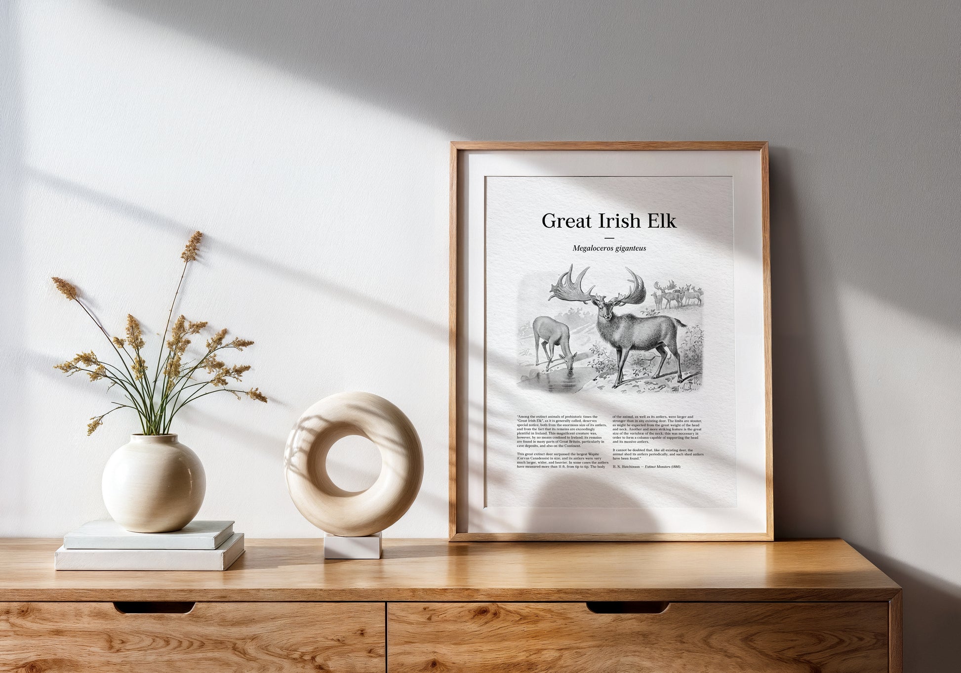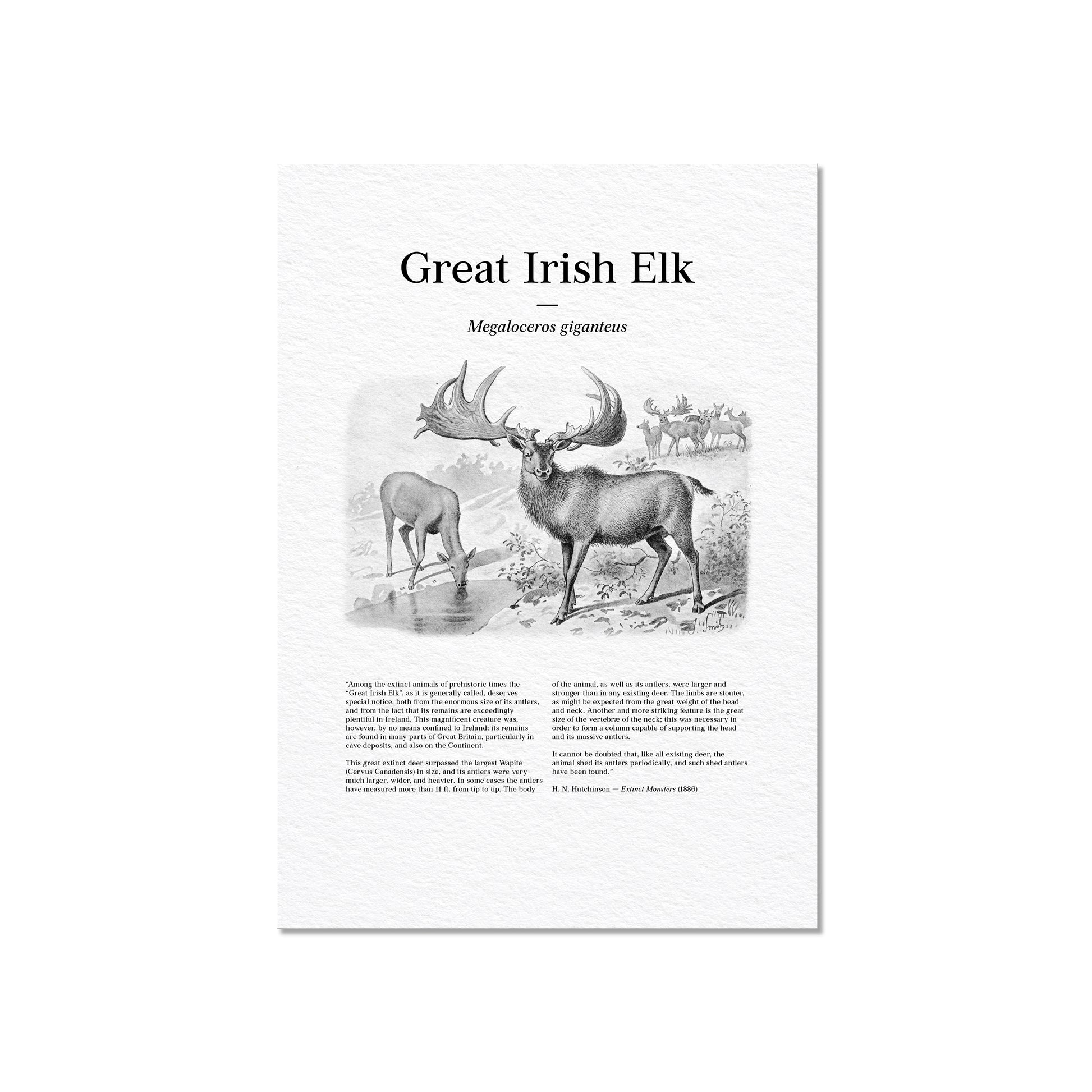 Restored from a late 19th-century scientific plate, this vintage illustration depicts the Great Irish Elk (Megaloceros giganteus), one of the largest deer to have ever lived, shown beside water with a herd receding into the background. The composition highlights the animal’s immense, sweeping antlers—rendered with dramatic scale and careful shading—emphasizing the Victorian fascination with size, strength, and structural anatomy in extinct mammals. Designed to evoke the appearance of an illustrated newspaper or popular science journal, the print incorporates original text reproduced from Extinct Monsters: A Popular Account of Some of the Larger Forms of Ancient Animal Life by Henry Neville Hutchinson, where these illustrations were first published in 1886. Carefully restored to preserve period typography, engraved textures, and tonal depth, this artwork combines early paleontological reconstruction with authentic historical text, resulting in a distinctive natural history print with a deliberate newspaper-style presentation.