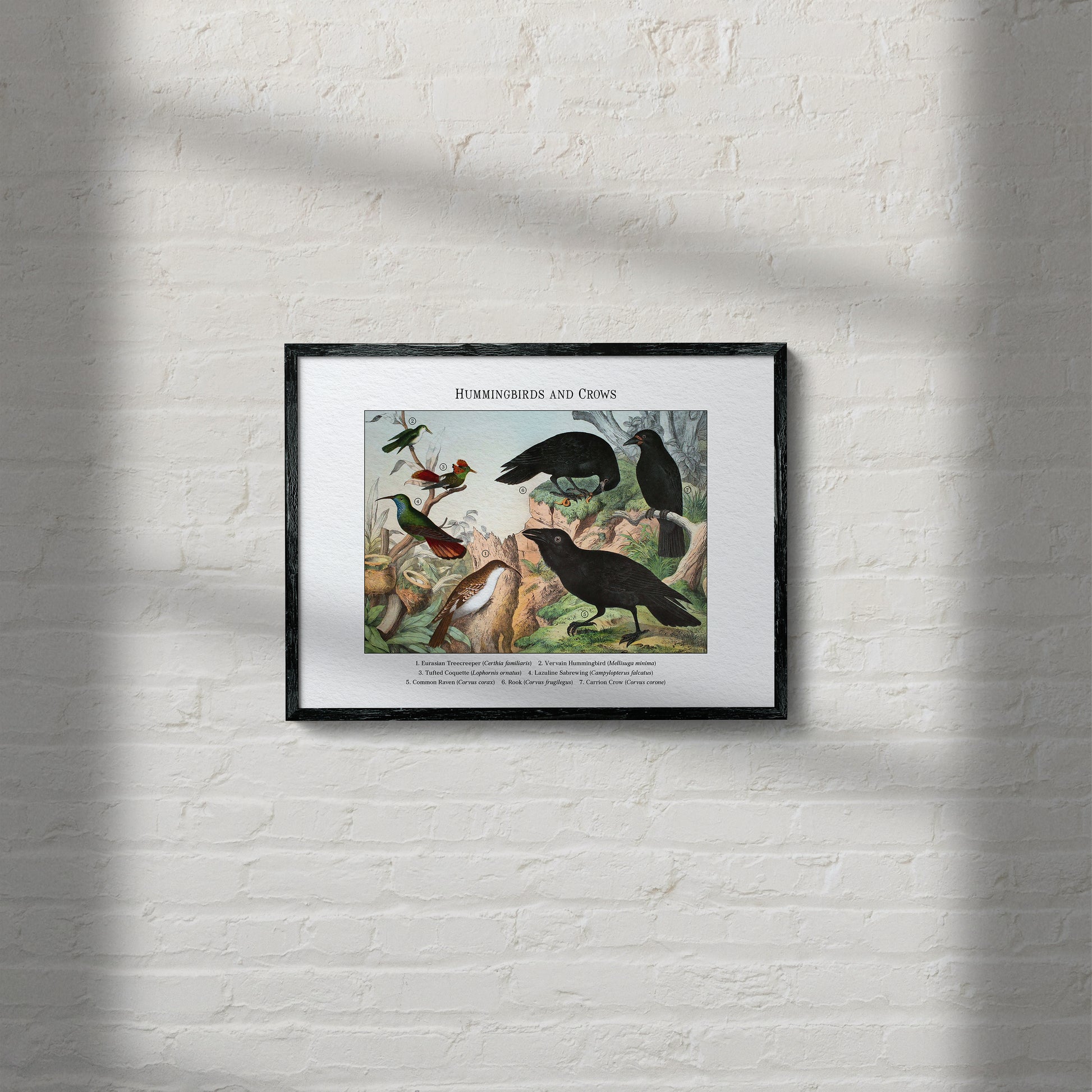 Restored from a 19th-century plate, this vintage scientific illustration brings together hummingbirds and crows—the Eurasian Treecreeper (Certhia familiaris), Vervain Hummingbird (Mellisuga minima), Tufted Coquette (Lophornis ornatus), Lazuline Sabrewing (Campylopterus falcatus), Common Raven (Corvus corax), Rook (Corvus frugilegus), and Carrion Crow (Corvus corone)—posed among leafy branches, trunk hollows, and nest cups. The restoration preserves period character while reviving fine linework and color, making it a striking natural history art print for study or display.