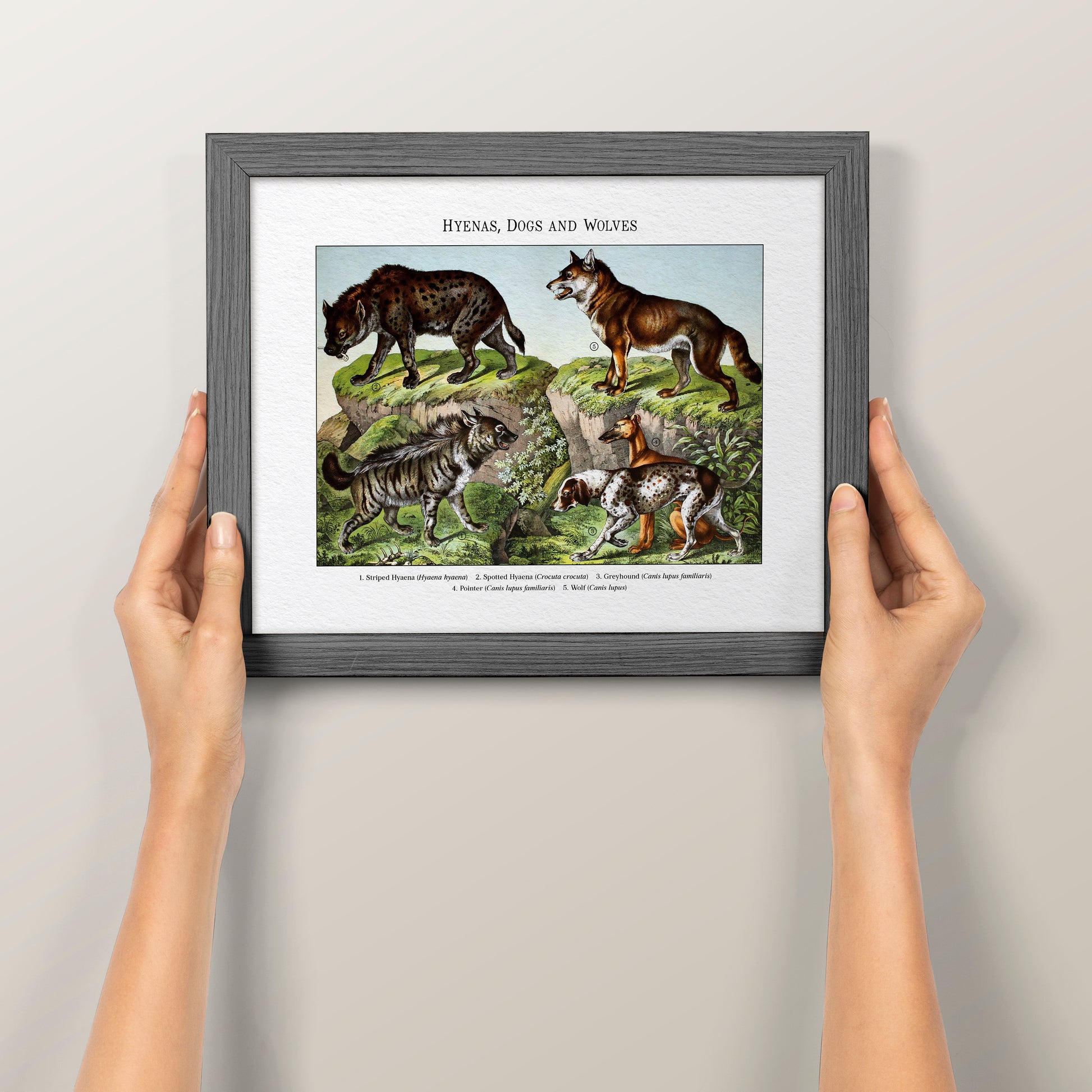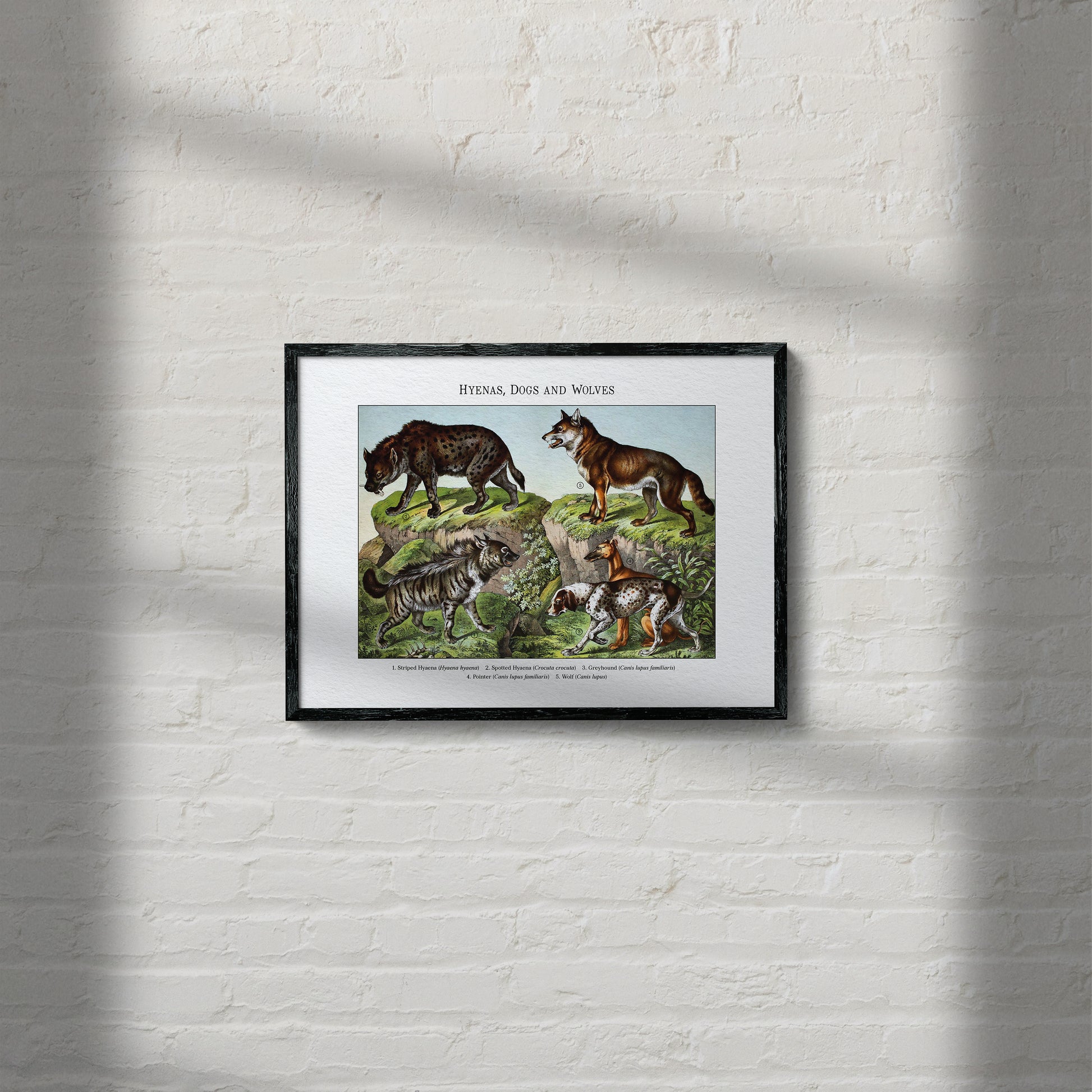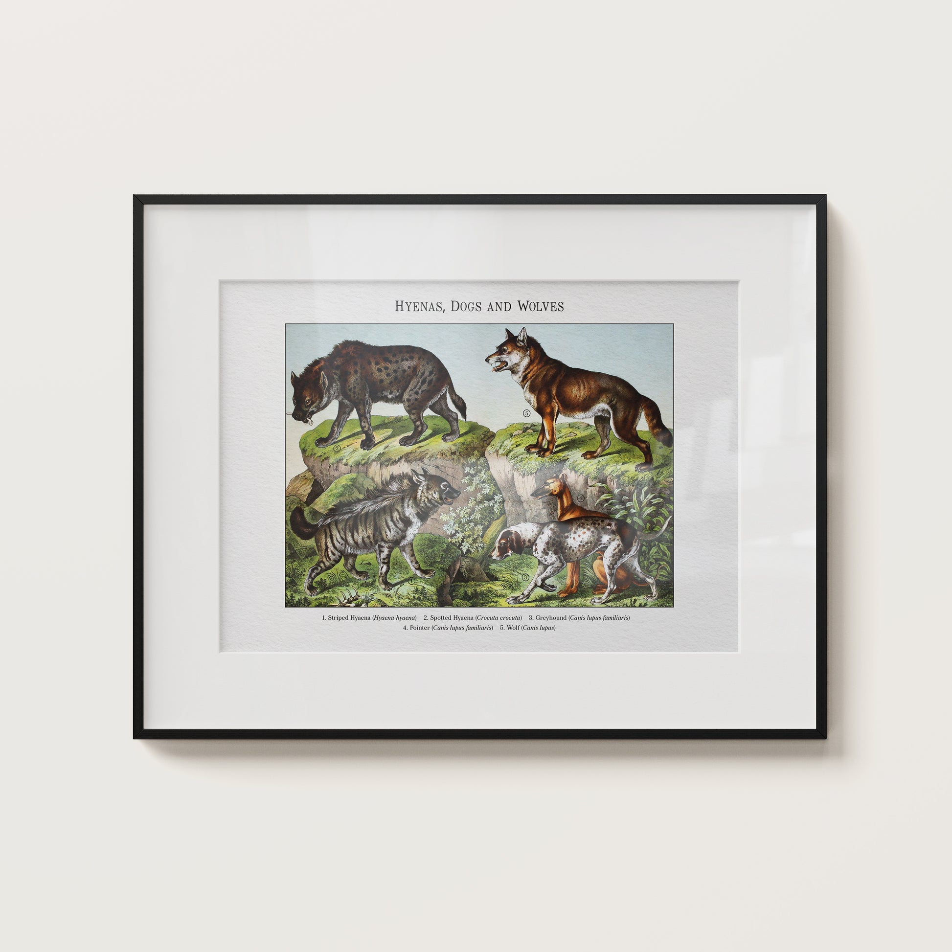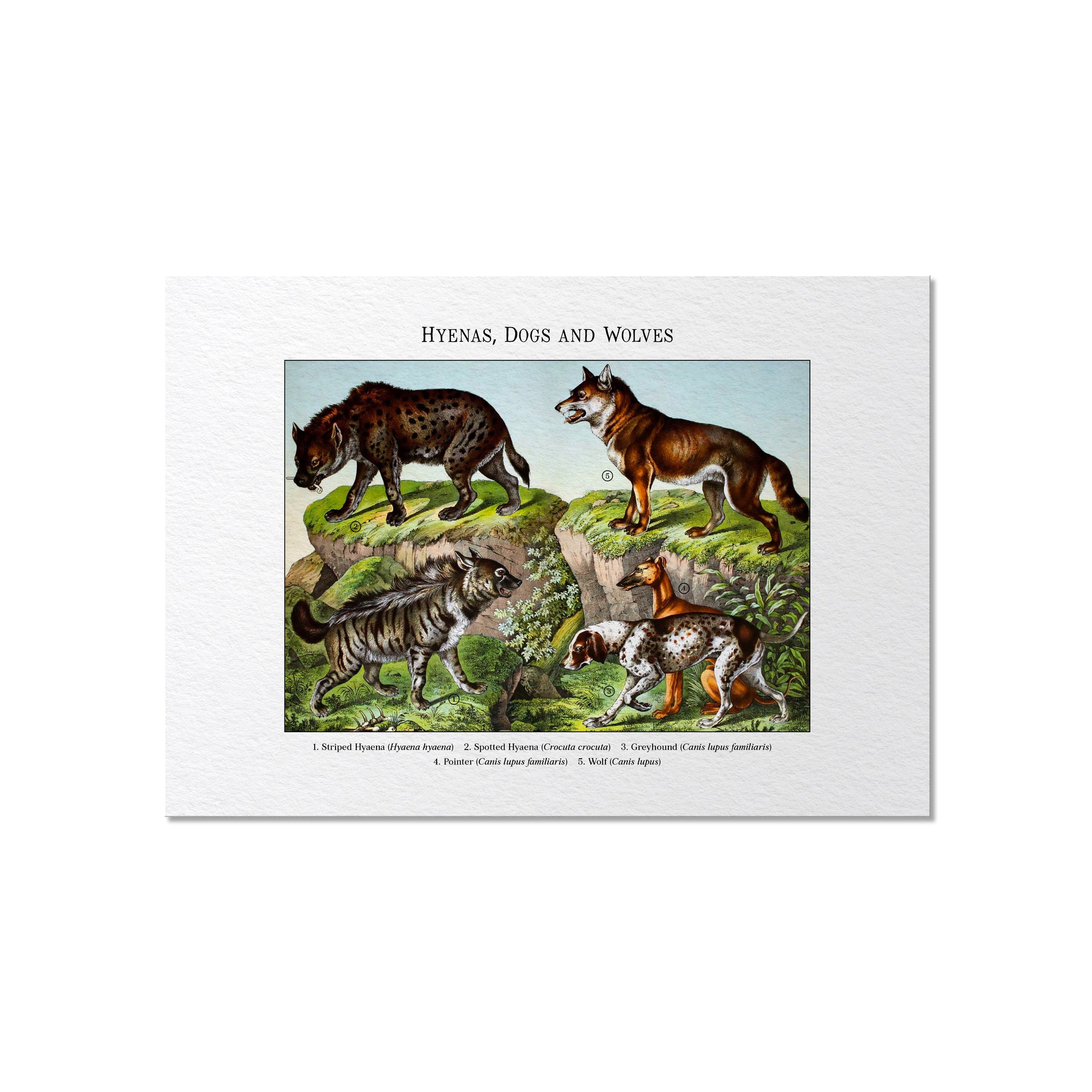 Restored from a 19th-century plate, this vintage scientific illustration brings together hyenas, dogs, and wolves—a Striped Hyaena (Hyaena hyaena), a Spotted Hyaena (Crocuta crocuta), a Greyhound and a Pointer (Canis lupus familiaris), and a Wolf (Canis lupus)—arranged on rocky terraces amid grasses and shrubs. The restoration preserves period character while reviving fine linework and color, making it a striking natural history art print for study or display.