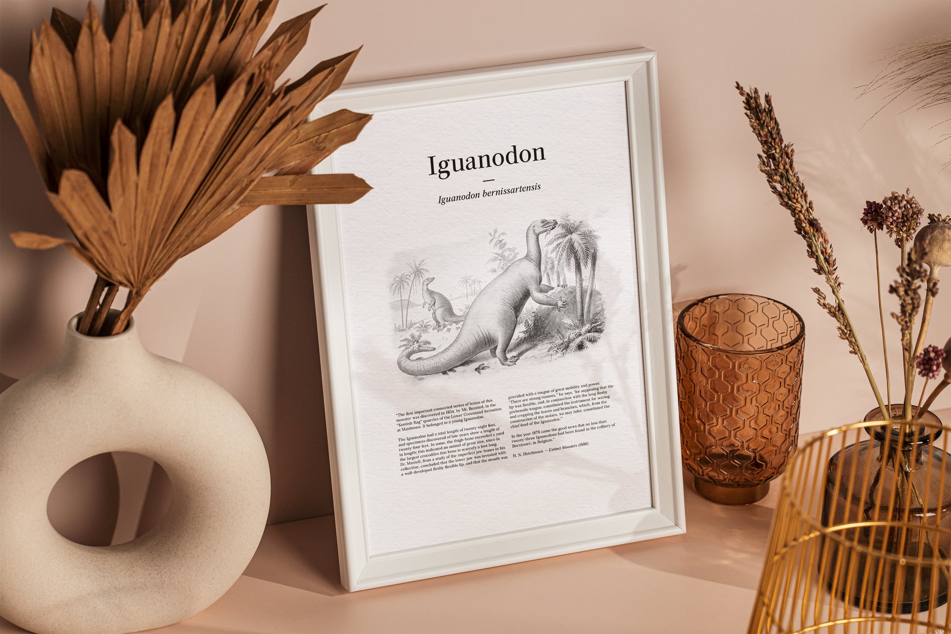 Restored from a late 19th-century scientific plate, this vintage illustration depicts the herbivorous Iguanodon (Iguanodon bernissartensis) browsing among palm-like trees in a lush prehistoric landscape, with a second individual shown in the distance. The composition reflects Victorian interpretations of Iguanodon as a large, semi-upright plant-eater, emphasizing its powerful hind limbs, heavy tail, and flexible forelimbs used for grasping vegetation. Designed to evoke the appearance of an illustrated newspaper or popular science journal, the print incorporates original text reproduced from Extinct Monsters: A Popular Account of Some of the Larger Forms of Ancient Animal Life by Henry Neville Hutchinson, where these illustrations were first published in 1886. Carefully restored to preserve period typography, engraved linework, and tonal shading, this artwork combines early paleontological reconstruction with authentic historical text, resulting in a distinctive natural history print with a deliberate newspaper-style presentation.