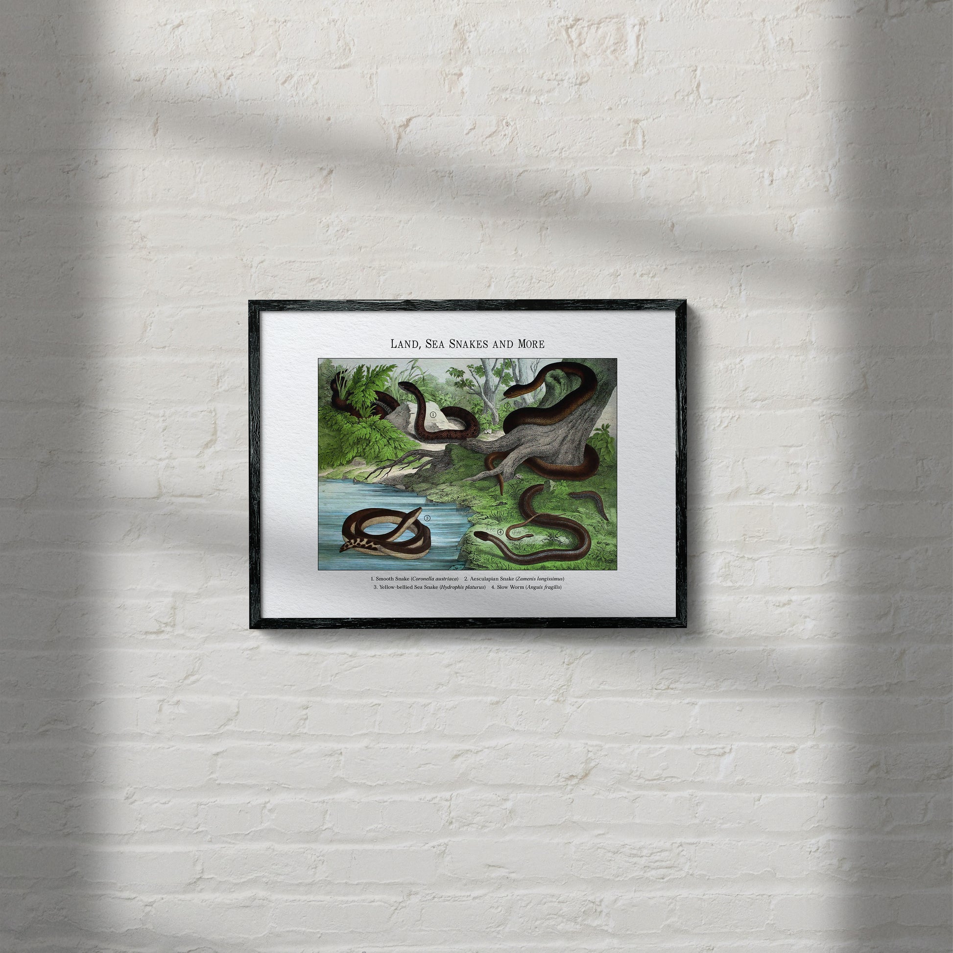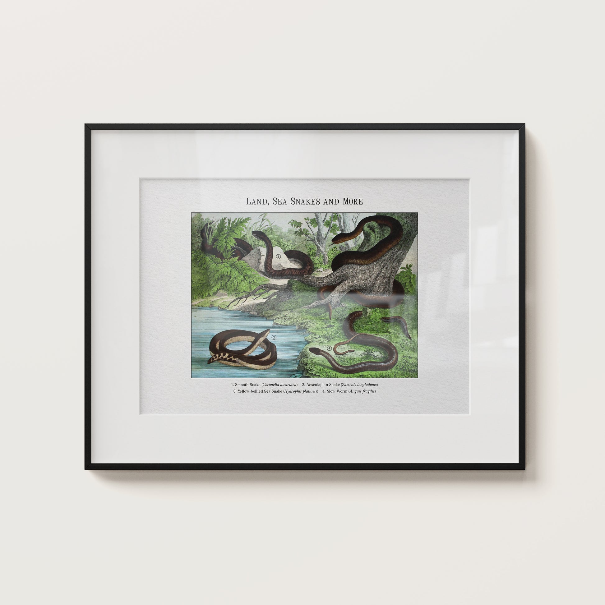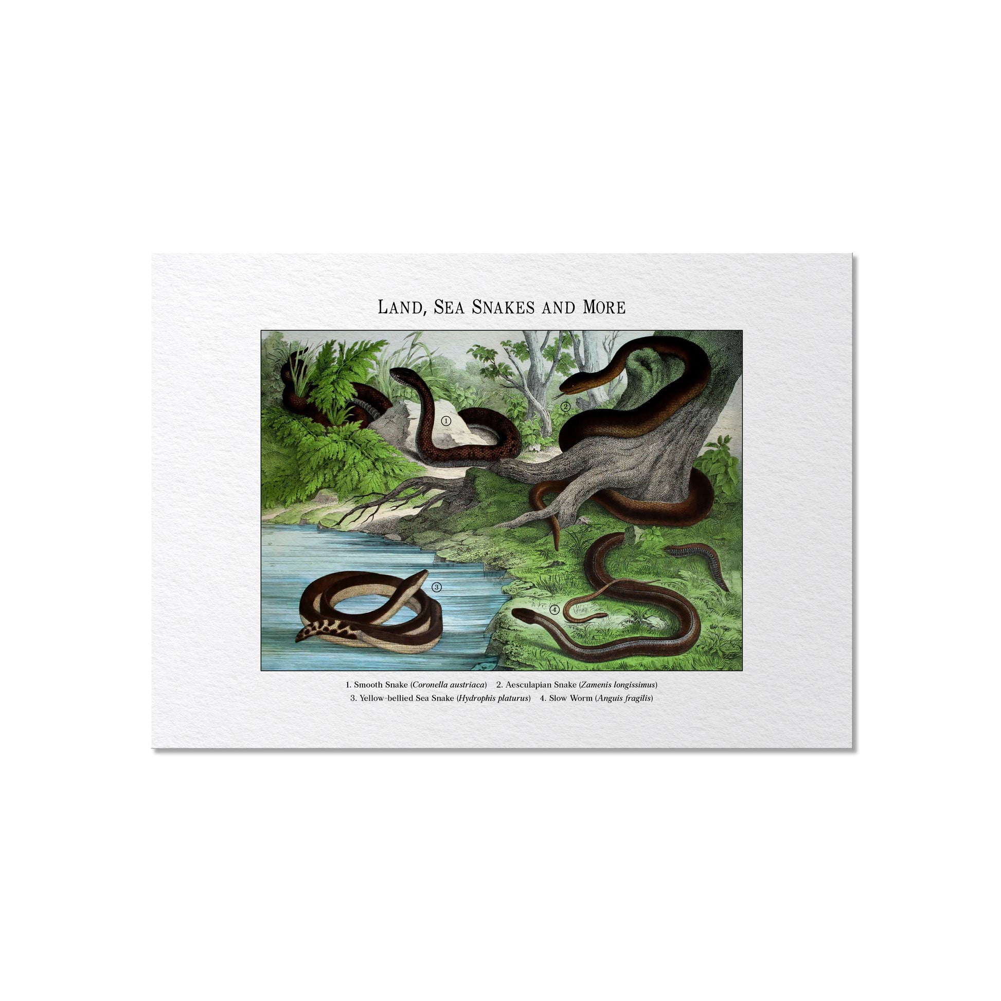 Restored from a 19th-century plate, this vintage scientific illustration gathers land and sea serpents—the Smooth Snake (Coronella austriaca), Aesculapian Snake (Zamenis longissimus), Yellow-bellied Sea Snake (Hydrophis platurus), and the legless Slow Worm (Anguis fragilis)—arranged along a shaded woodland bank and waterside with roots, ferns, and rocks. The restoration preserves period character while reviving fine linework and color, making it a striking natural history art print for study or display.