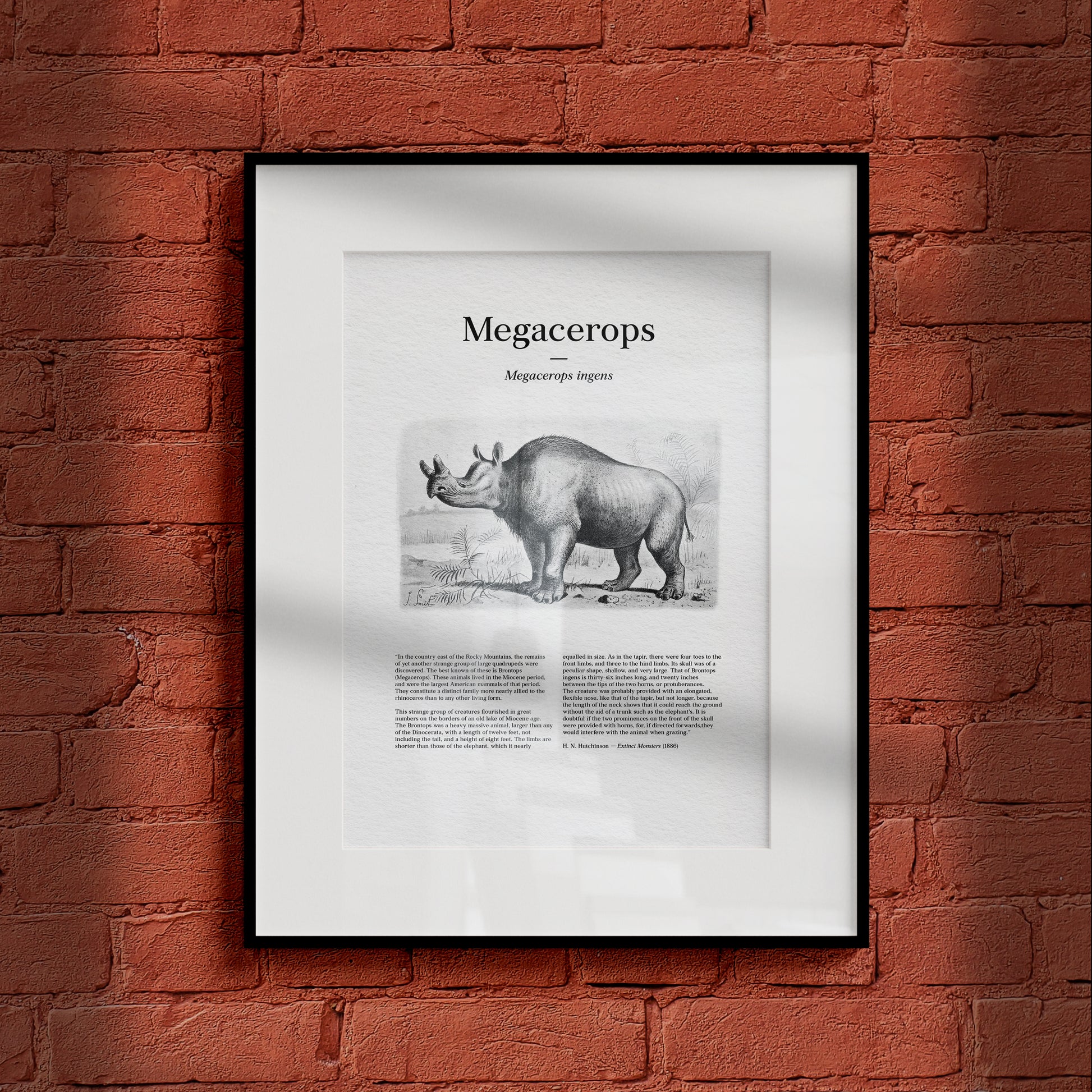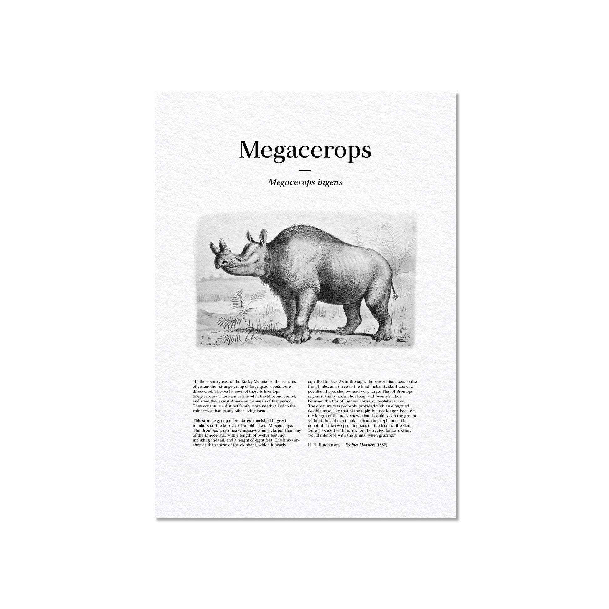 Restored from a late 19th-century scientific plate, this vintage illustration depicts Megacerops (Megacerops ingens), also known historically as Brontops, shown standing in a sparsely vegetated prehistoric landscape. The animal’s massive body, stout limbs, and distinctive paired horn-like projections on the skull reflect Victorian interpretations of early large mammals as formidable, rhinoceros-like giants of the Miocene. Designed to evoke the appearance of an illustrated newspaper or popular science journal, the print incorporates original text reproduced from Extinct Monsters: A Popular Account of Some of the Larger Forms of Ancient Animal Life by Henry Neville Hutchinson, where these illustrations were first published in 1886. Carefully restored to preserve period typography, engraved textures, and tonal shading, this artwork blends early paleontological reconstruction with authentic historical text, resulting in a distinctive natural history print with a deliberate newspaper-style presentation.
