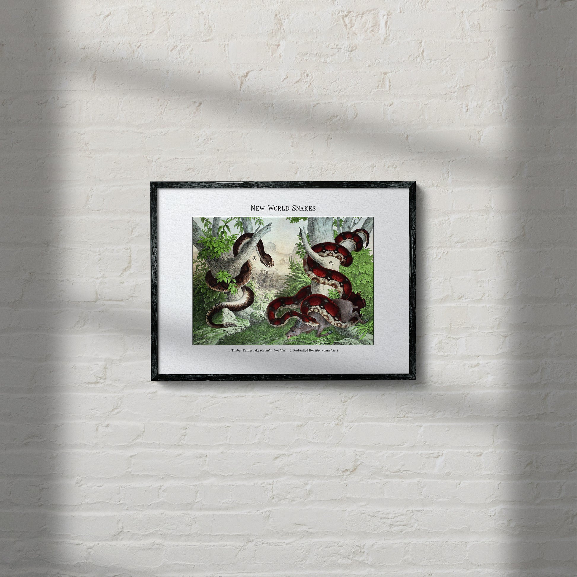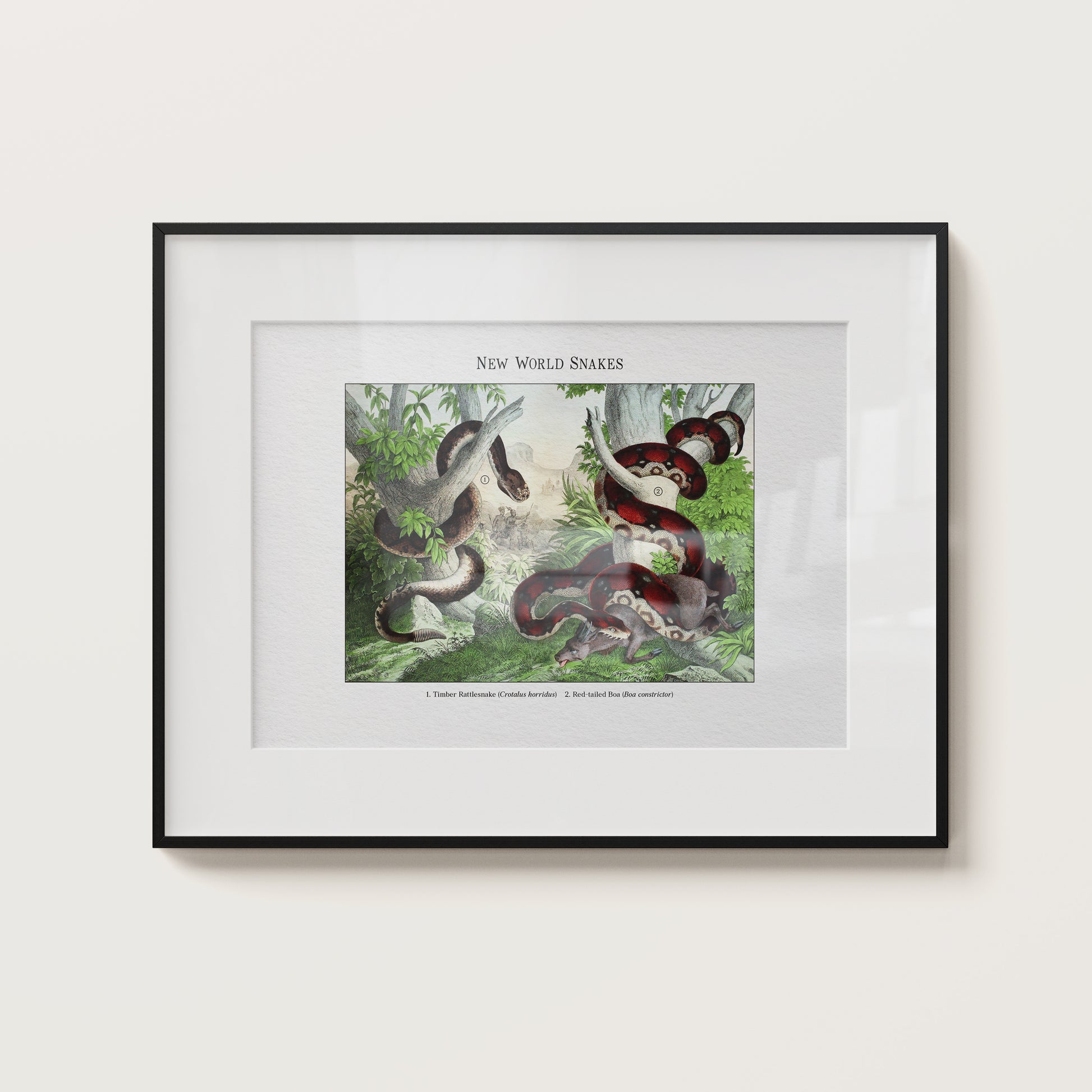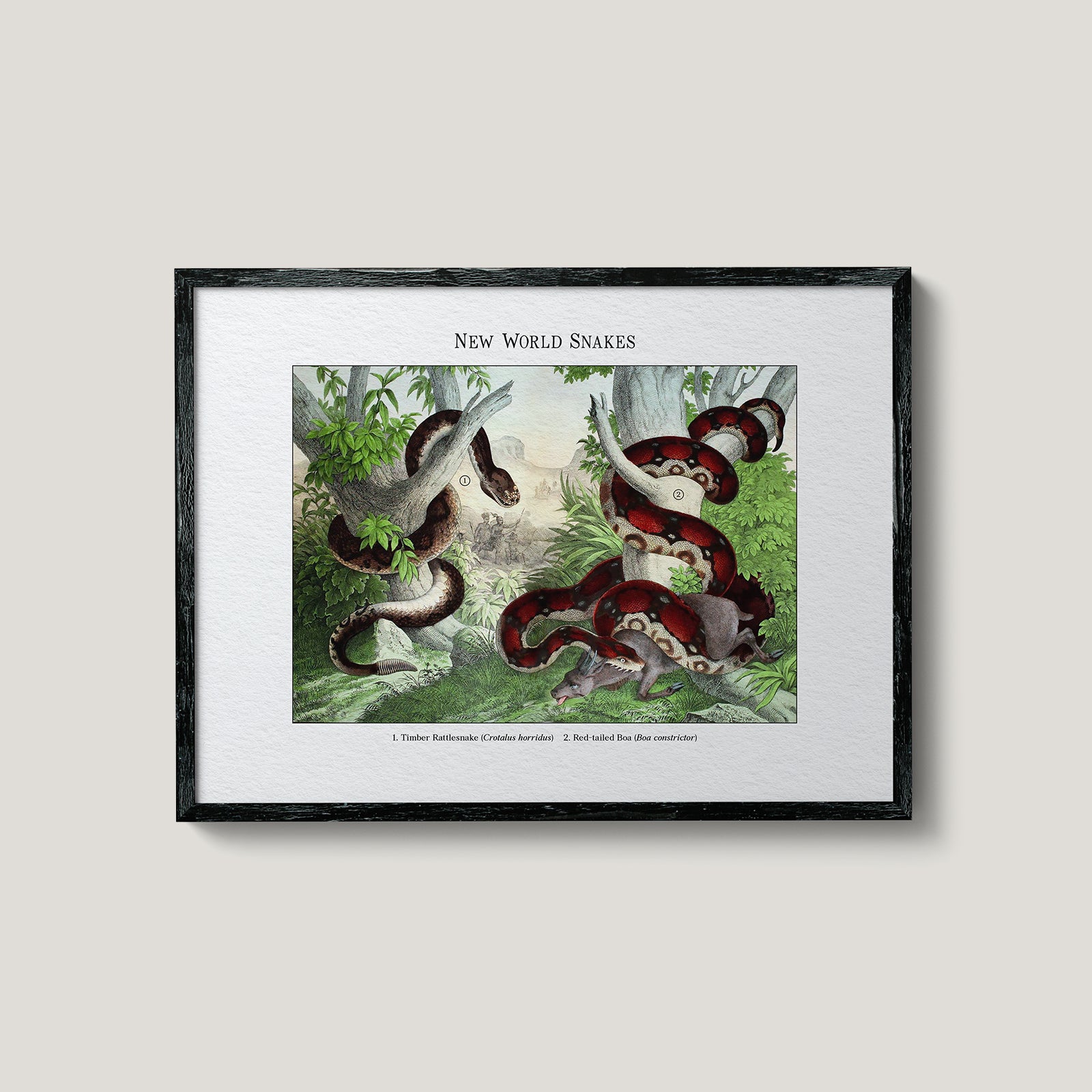Restored from a 19th-century plate, this vintage scientific illustration brings together New World snakes—the Timber Rattlesnake (Crotalus horridus) and the Red-tailed Boa (Boa constrictor)—coiled among tree trunks and leafy undergrowth, with the boa subduing its prey. The restoration preserves period character while reviving fine linework and color, making it a striking natural history art print for study or display.