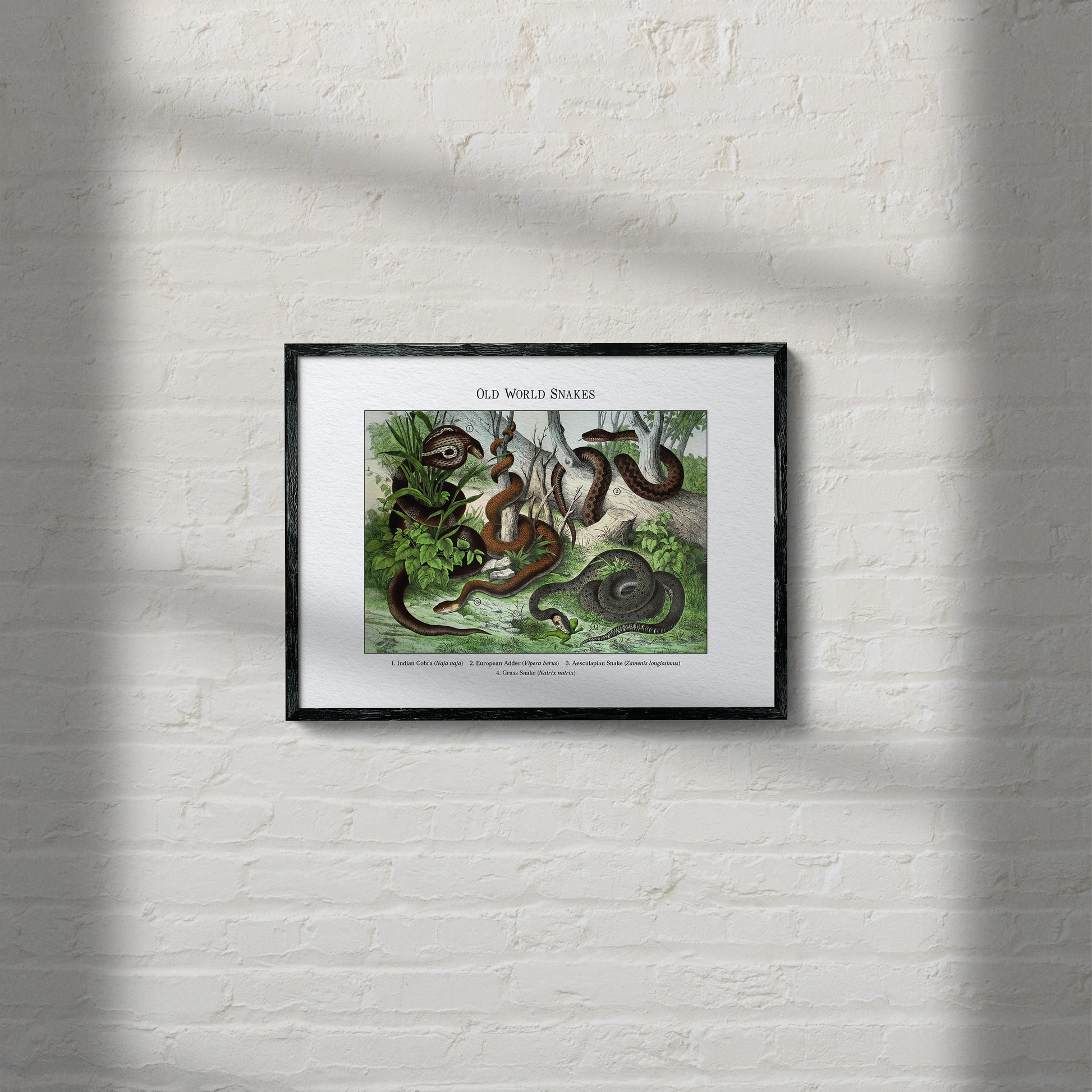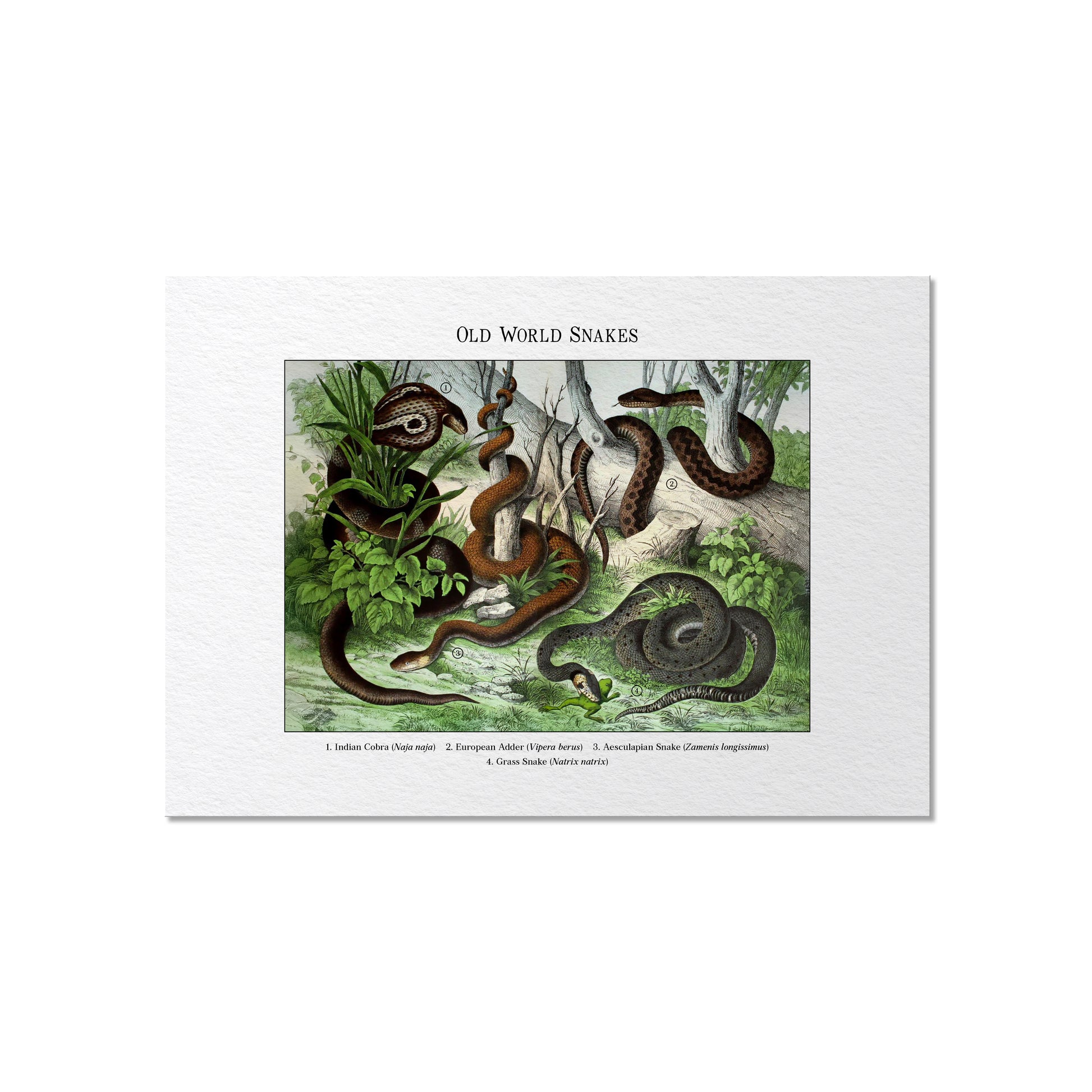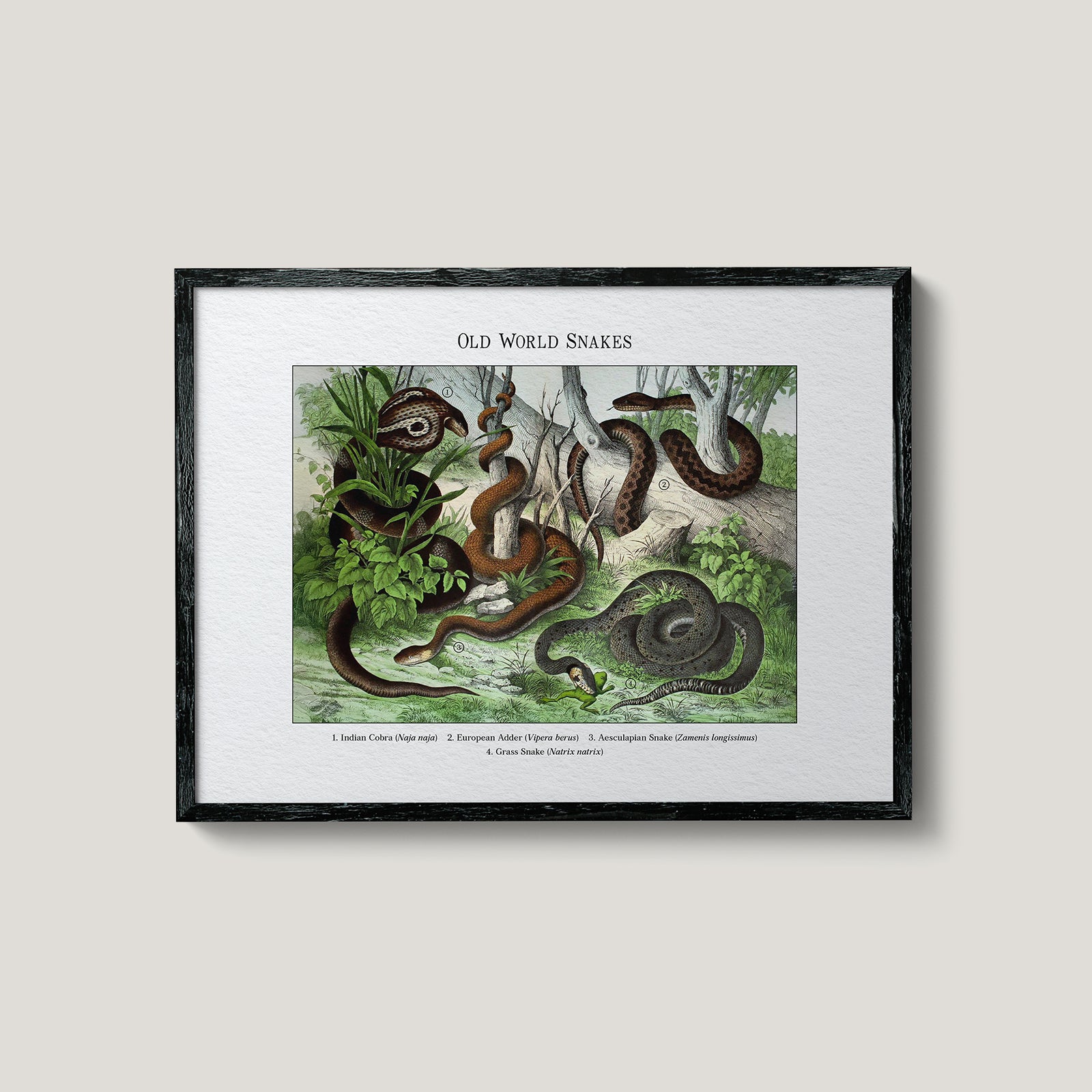 Restored from a 19th-century plate, this vintage scientific illustration brings together Old World snakes—the Indian Cobra (Naja naja), European Adder (Vipera berus), Aesculapian Snake (Zamenis longissimus), and Grass Snake (Natrix natrix)—coiled around pale tree trunks and leafy banks, with one swallowing a frog beside a shaded stream. The restoration preserves period character while reviving fine linework and color, making it a striking natural history art print for study or display.