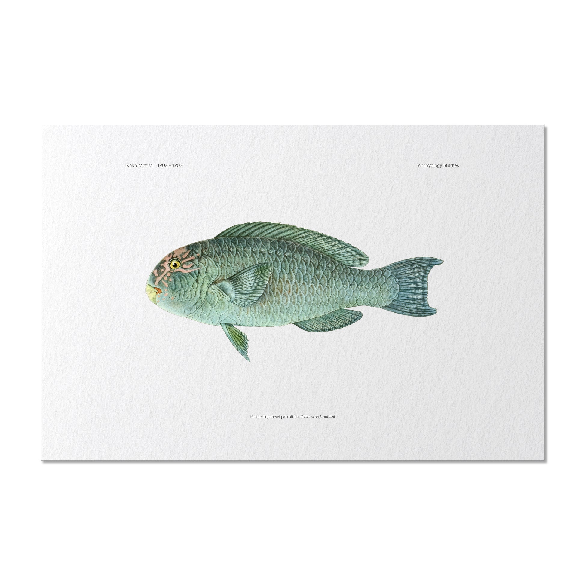 Restored from an early 20th-century plate, this vintage scientific illustration presents a single reef fish—the Pacific slopehead parrotfish (Chlorurus frontalis)—shown in full profile with layered scales and subtle turquoise and rose markings against a spacious white ground. The restoration preserves the quiet period typography while reviving fine linework and luminous color, making it a refined natural history art print for coastal interiors, studios, or ichthyology lovers.