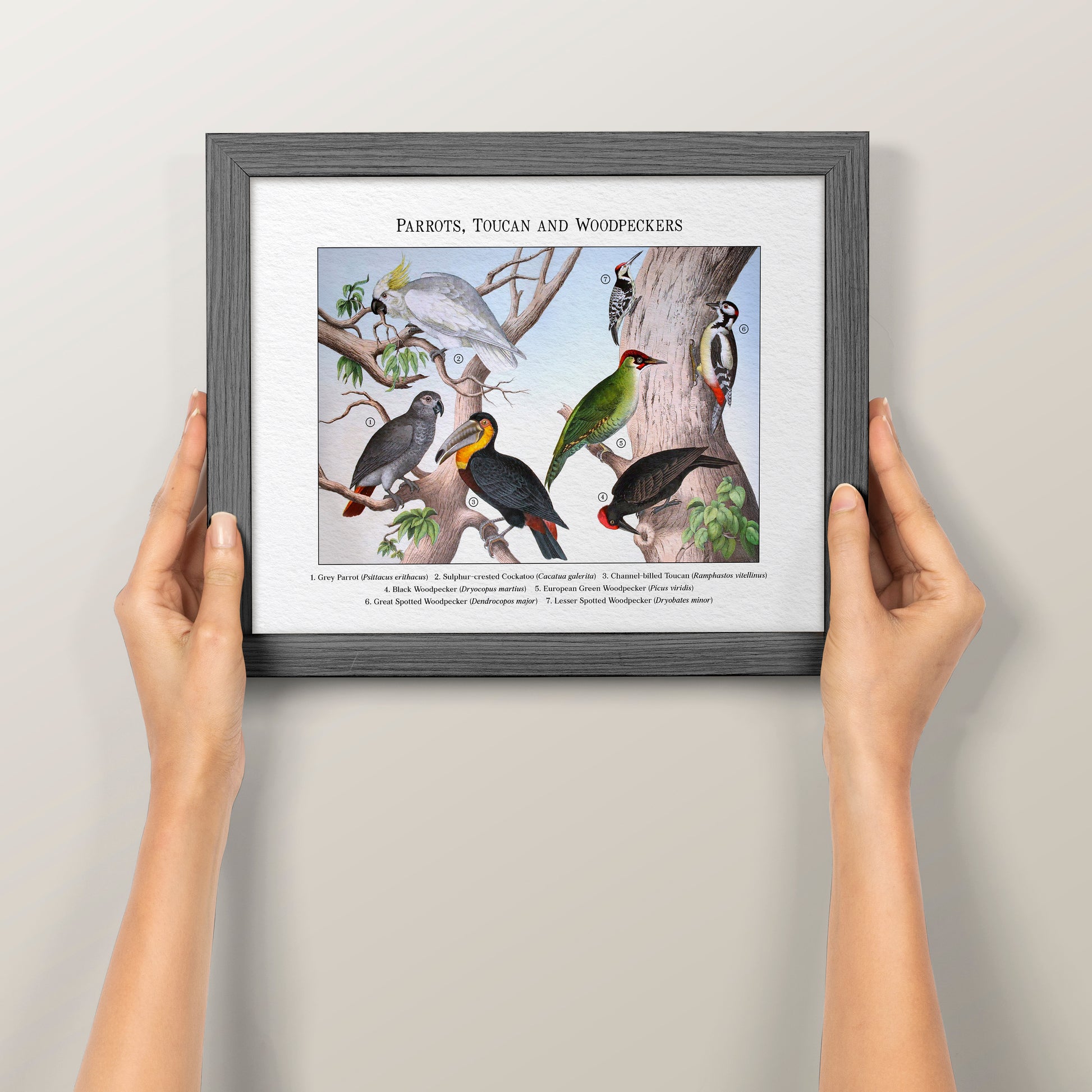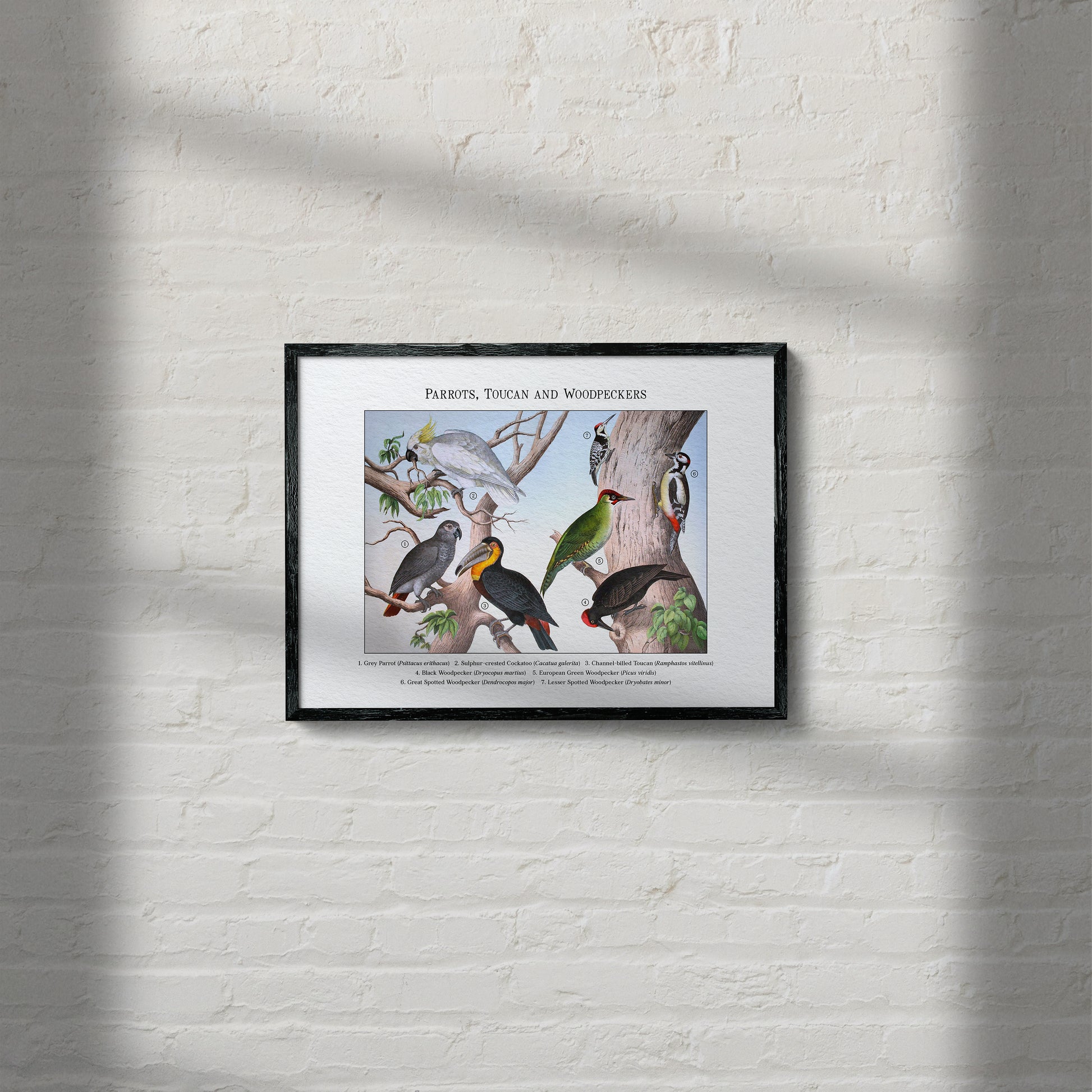 Restored from a 19th-century plate, this vintage scientific illustration gathers parrots, a toucan, and woodpeckers—the Grey Parrot (Psittacus erithacus), Sulphur-crested Cockatoo (Cacatua galerita), Channel-billed Toucan (Ramphastos vitellinus), Black Woodpecker (Dryocopus martius), European Green Woodpecker (Picus viridis), Great Spotted Woodpecker (Dendrocopos major), and Lesser Spotted Woodpecker (Dryobates minor)—arranged on branching boughs and pale tree trunks against a soft sky. The restoration preserves period character while reviving fine linework and color, making it a striking natural history art print for study or display.