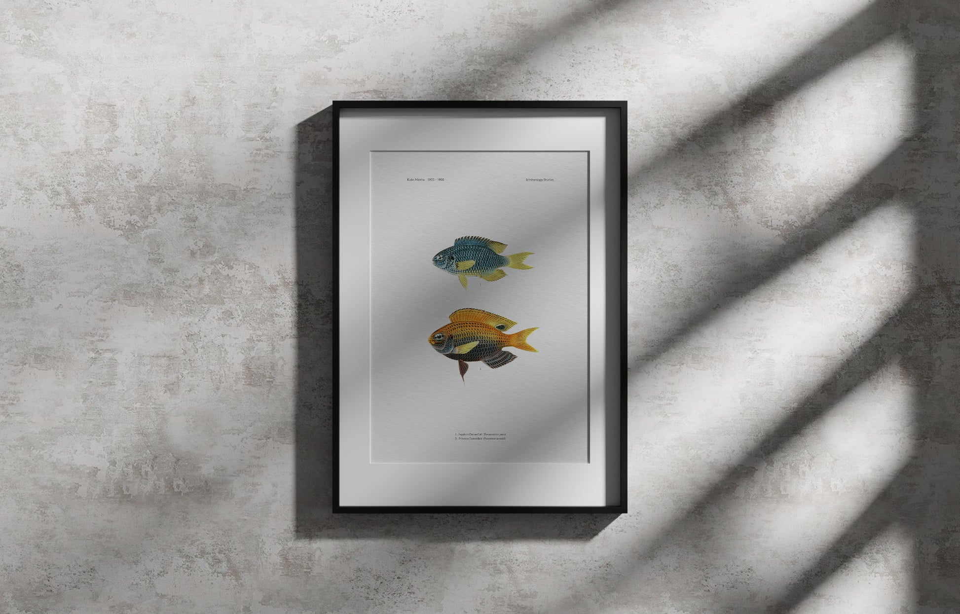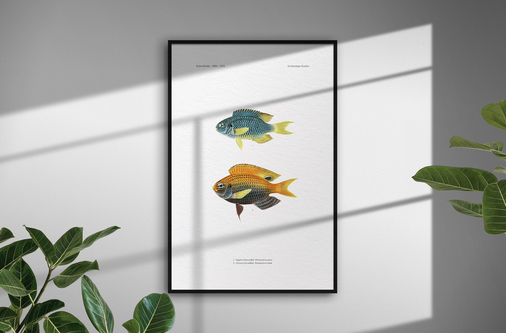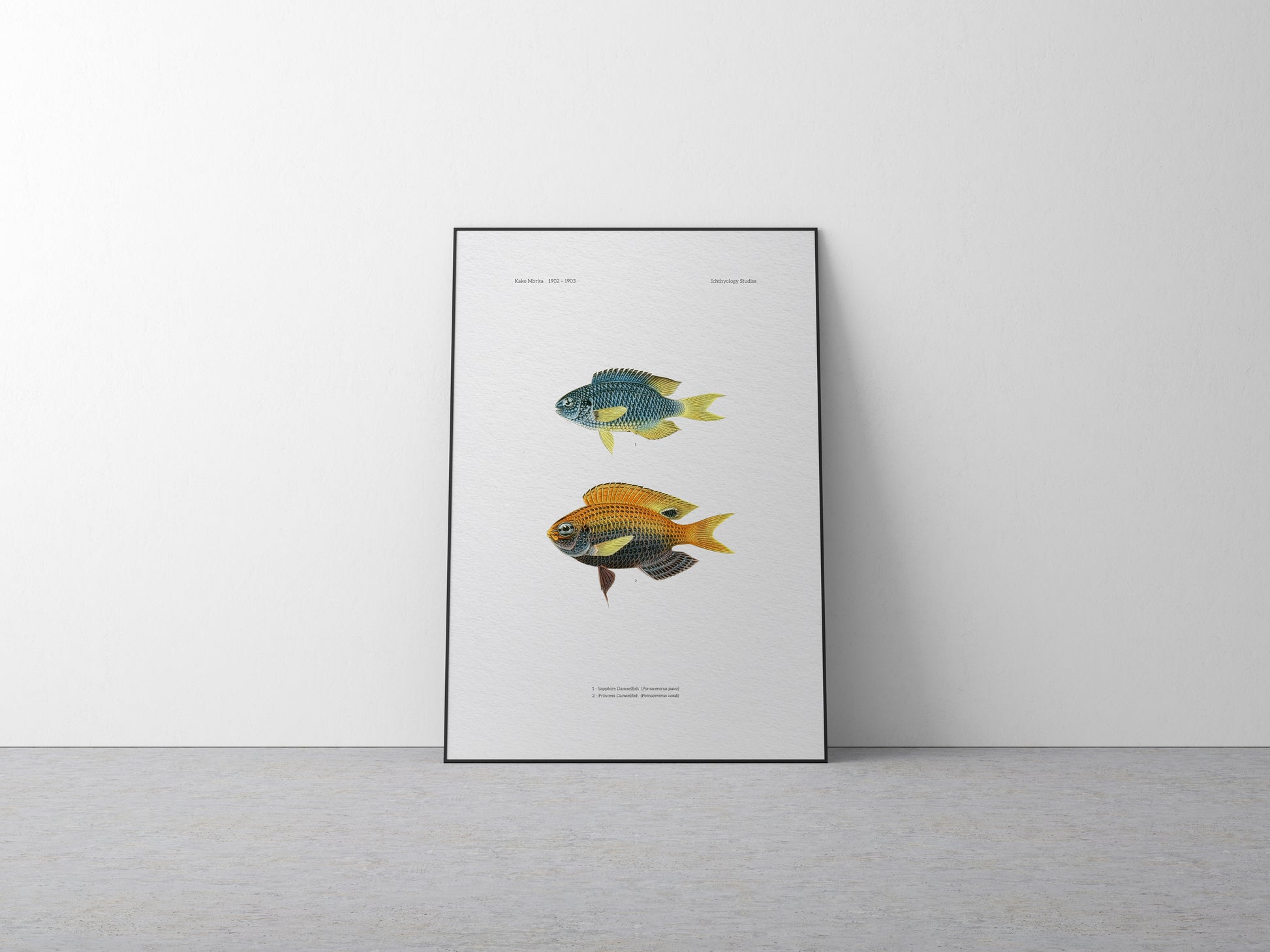 Restored from an early 20th-century plate, this vintage scientific illustration presents two reef fishes—the Sapphire damselfish (Pomacentrus pavo) and Princess damselfish (Pomacentrus vaiuli)—arranged in profile as separate specimens against a spacious white ground. The restoration preserves the quiet period typography while reviving fine linework and luminous color, making it a refined natural history art print for coastal interiors, studios, or ichthyology lovers.