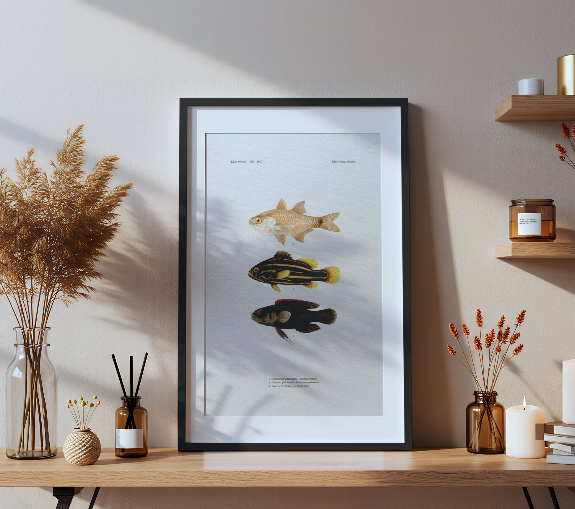 Restored from an early 20th-century plate, this vintage scientific illustration presents three reef fishes—the Shimmering cardinalfish (Taeniamia lineolata), Goldenstriped soapfish (Grammistes sexlineatus), and Coral devil (Plesiops coeruleolineatus)—arranged in profile as separate specimens against a spacious white ground. The restoration preserves the quiet period typography while reviving fine linework and luminous color, making it a refined natural history art print for coastal interiors, studios, or ichthyology lovers.
