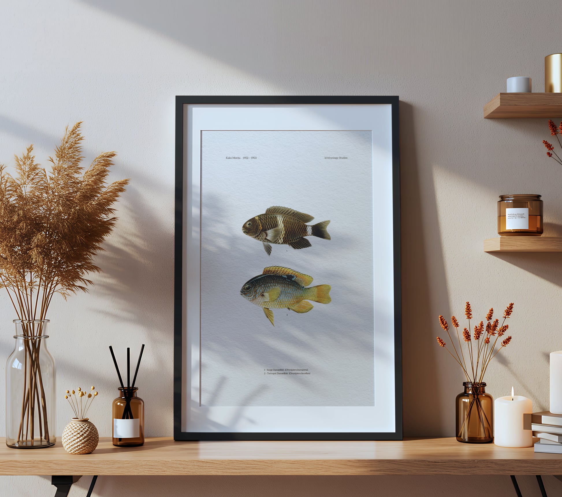 Restored from an early 20th-century plate, this vintage scientific illustration presents two reef fishes—the Surge damselfish (Chrysiptera leucopoma) and Twinspot damselfish (Chrysiptera biocellata)—arranged in profile as separate specimens against a spacious white ground. The restoration preserves the quiet period typography while reviving fine linework and luminous color, making it a refined natural history art print for coastal interiors, studios, or ichthyology lovers.