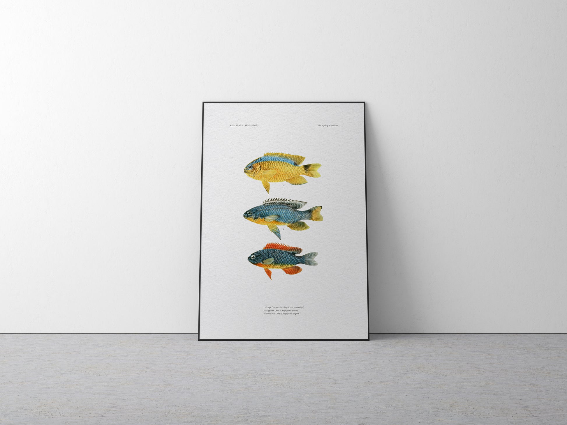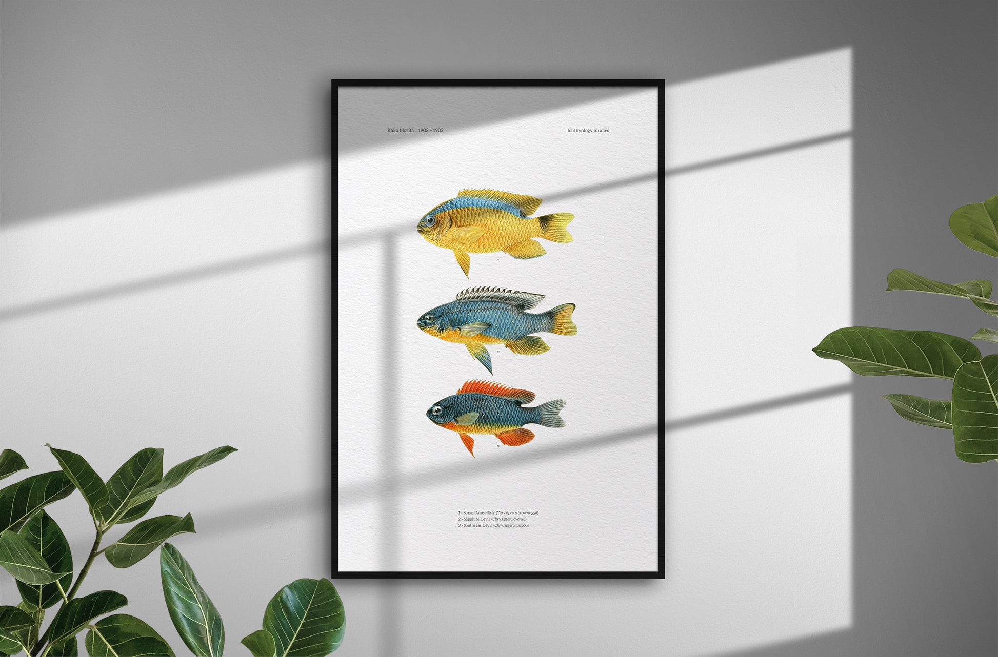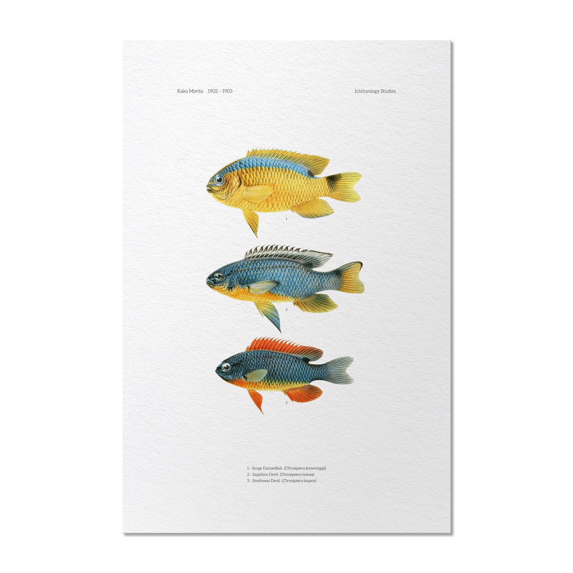 Restored from an early 20th-century plate, this vintage scientific illustration presents three reef fishes—the Surge damselfish (Chrysiptera brownriggii), Sapphire devil (Chrysiptera cyanea), and Southeast devil (Chrysiptera taupou)—arranged in profile as separate specimens against a spacious white ground. The restoration preserves the quiet period typography while reviving fine linework and luminous color, making it a refined natural history art print for coastal interiors, studios, or ichthyology lovers.