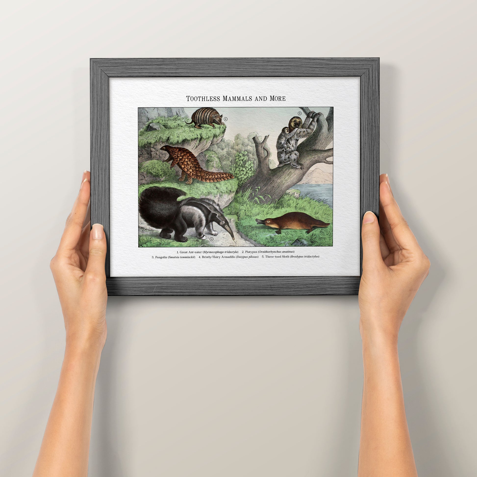 Restored from a 19th-century plate, this vintage scientific illustration brings together the “toothless” mammals and allies—the Great Ant-eater (Myrmecophaga tridactyla), Platypus (Ornithorhynchus anatinus), Pangolin (Smutsia temminckii), Bristly/Hairy Armadillo (Dasypus pilosus), and Three-toed Sloth (Bradypus tridactylus)—arranged on rocky ledges beside a riverside tree. The restoration preserves period character while reviving fine linework and color, making it a striking natural history art print for study or display.