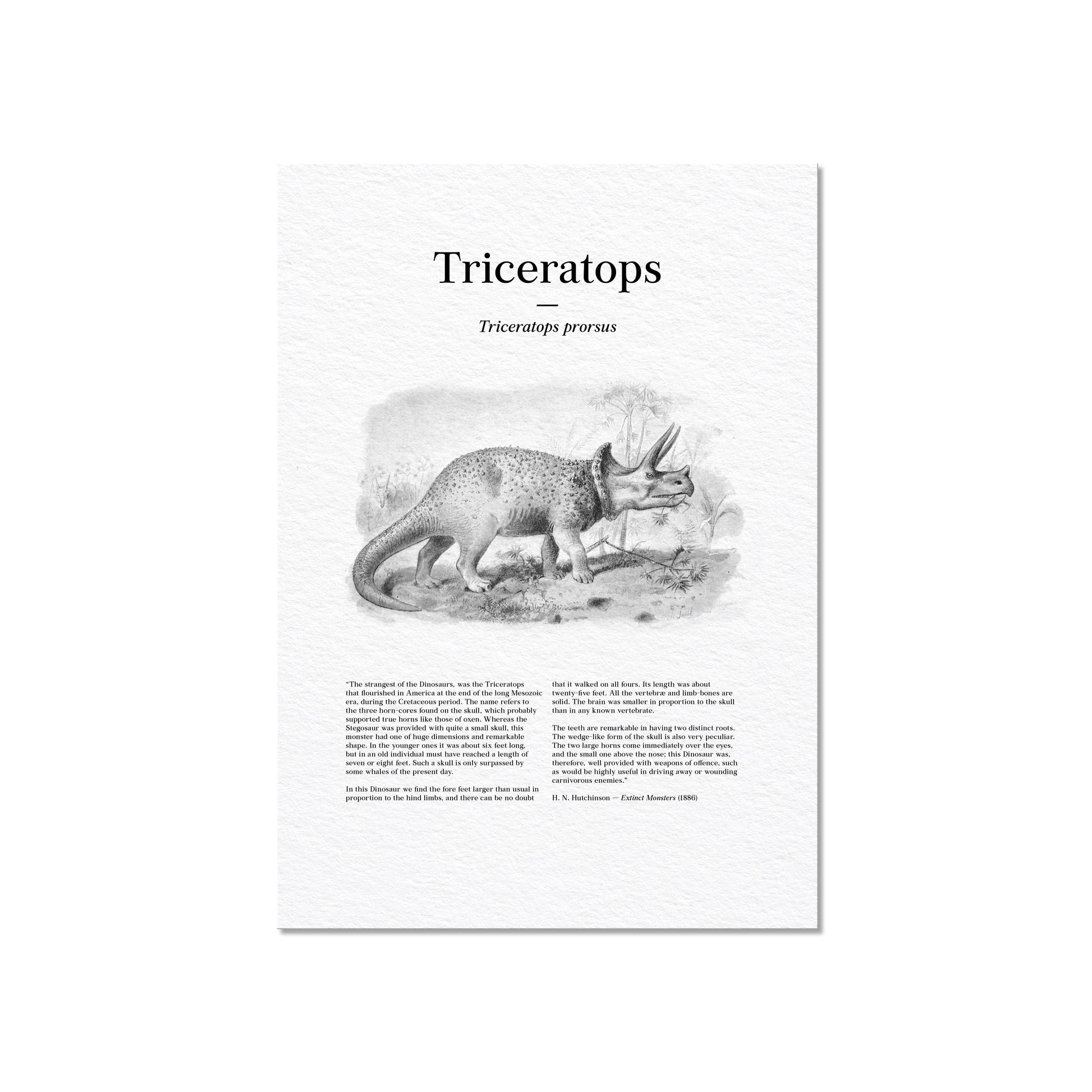 Restored from a late 19th-century scientific plate, this vintage illustration of the Triceratops (Triceratops prorsus) is presented with its original accompanying text to evoke the look and feel of a Victorian-era newspaper or illustrated science journal. The engraving shows the massive, four-footed herbivore advancing through a sparse Cretaceous landscape, its three prominent horns and broad frill rendered according to contemporary scientific understanding. The surrounding text is reproduced from Extinct Monsters: A Popular Account of Some of the Larger Forms of Ancient Animal Life by Henry Neville Hutchinson, the book in which these illustrations were first published. Carefully restored to preserve period typography, tonal depth, and engraved linework, this print combines early paleontological imagery and original historical text, creating a distinctive natural history artwork with a deliberate newspaper-style presentation.
