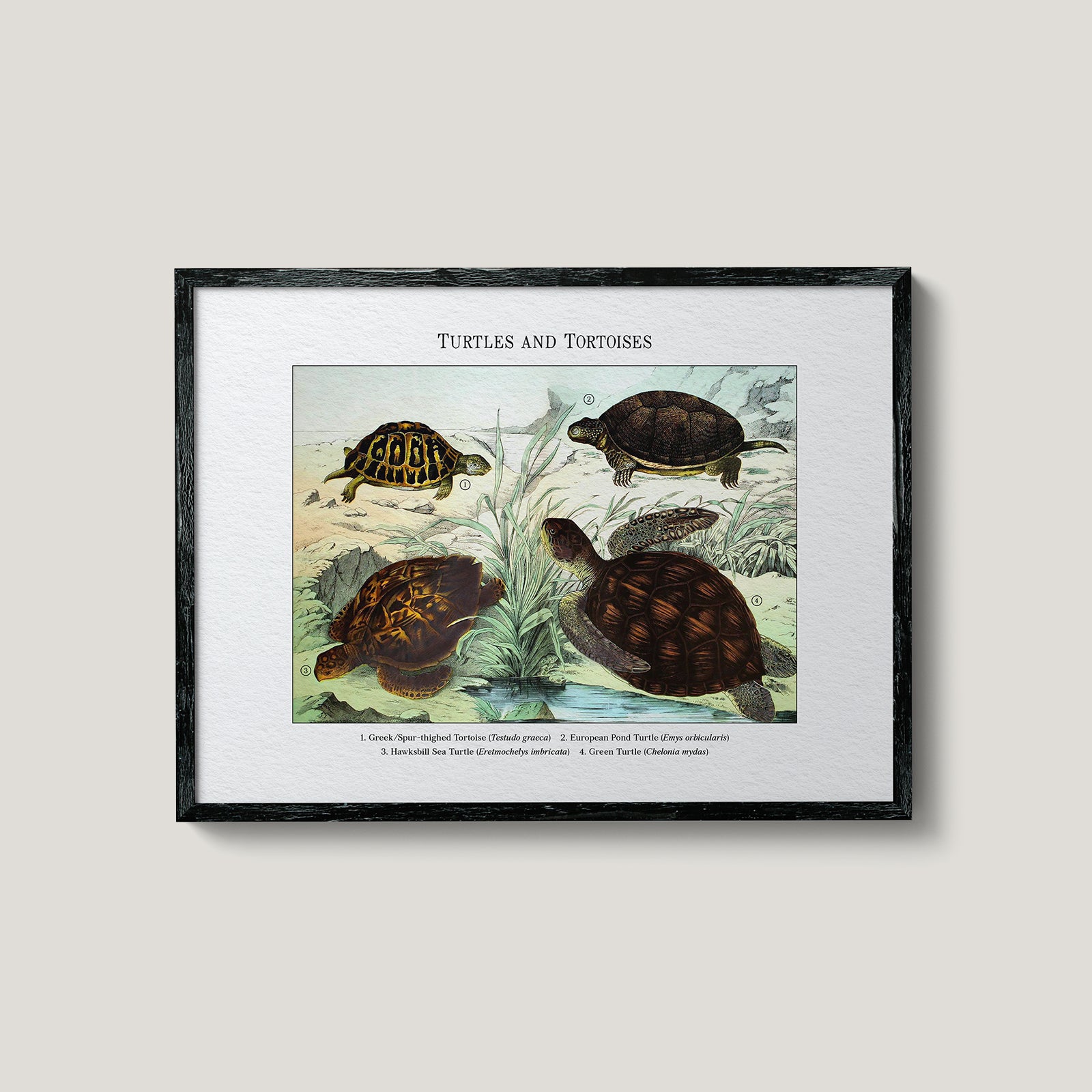 Restored from a 19th-century plate, this vintage scientific illustration gathers turtles and tortoises—the Greek Spur-thighed Tortoise (Testudo graeca), European Pond Turtle (Emys orbicularis), Hawksbill Sea Turtle (Eretmochelys imbricata), and Green Turtle (Chelonia mydas)—arranged around a sandy bank and calm shallows with reeds and aquatic plants. The restoration preserves period character while reviving fine linework and color, making it a striking natural history art print for study or display.