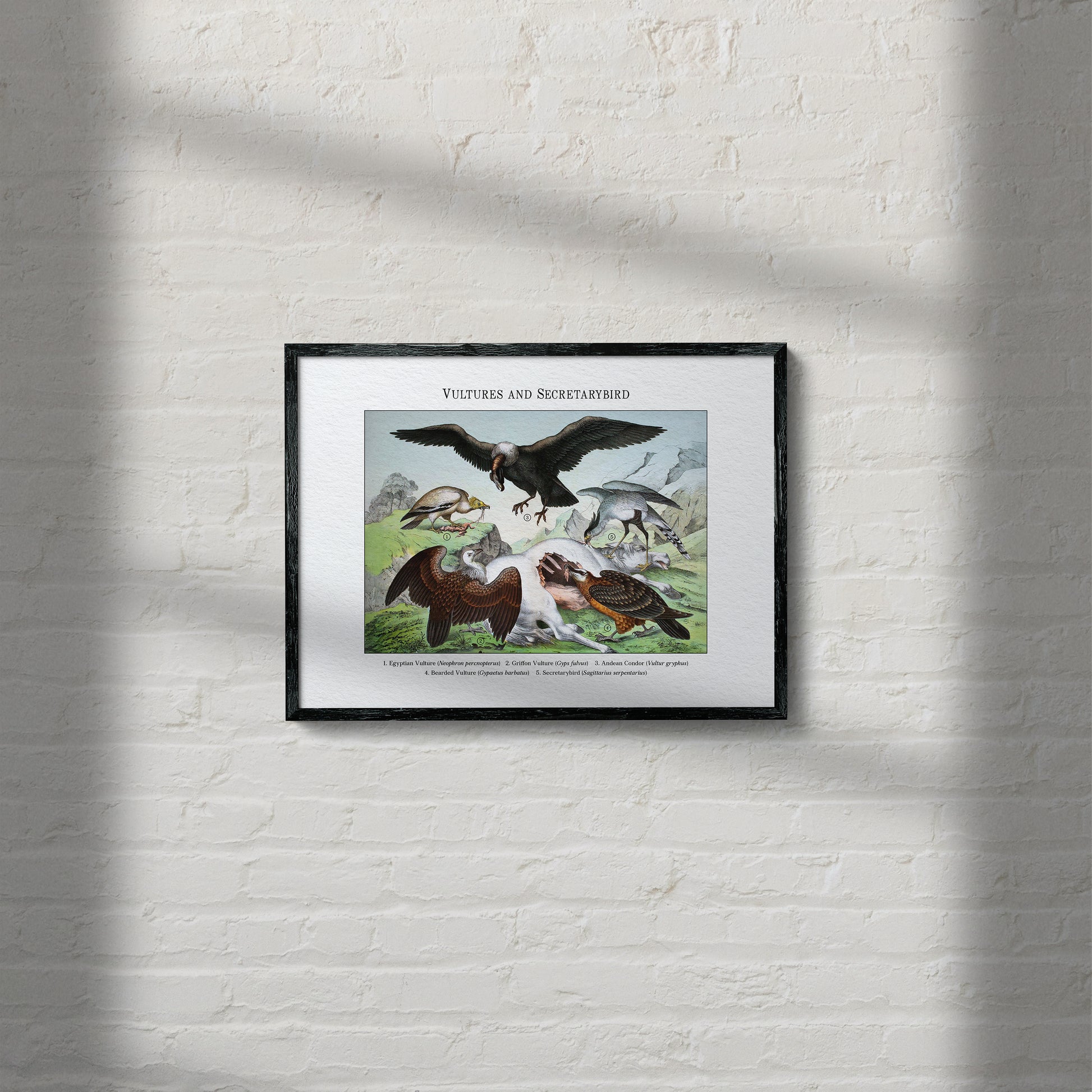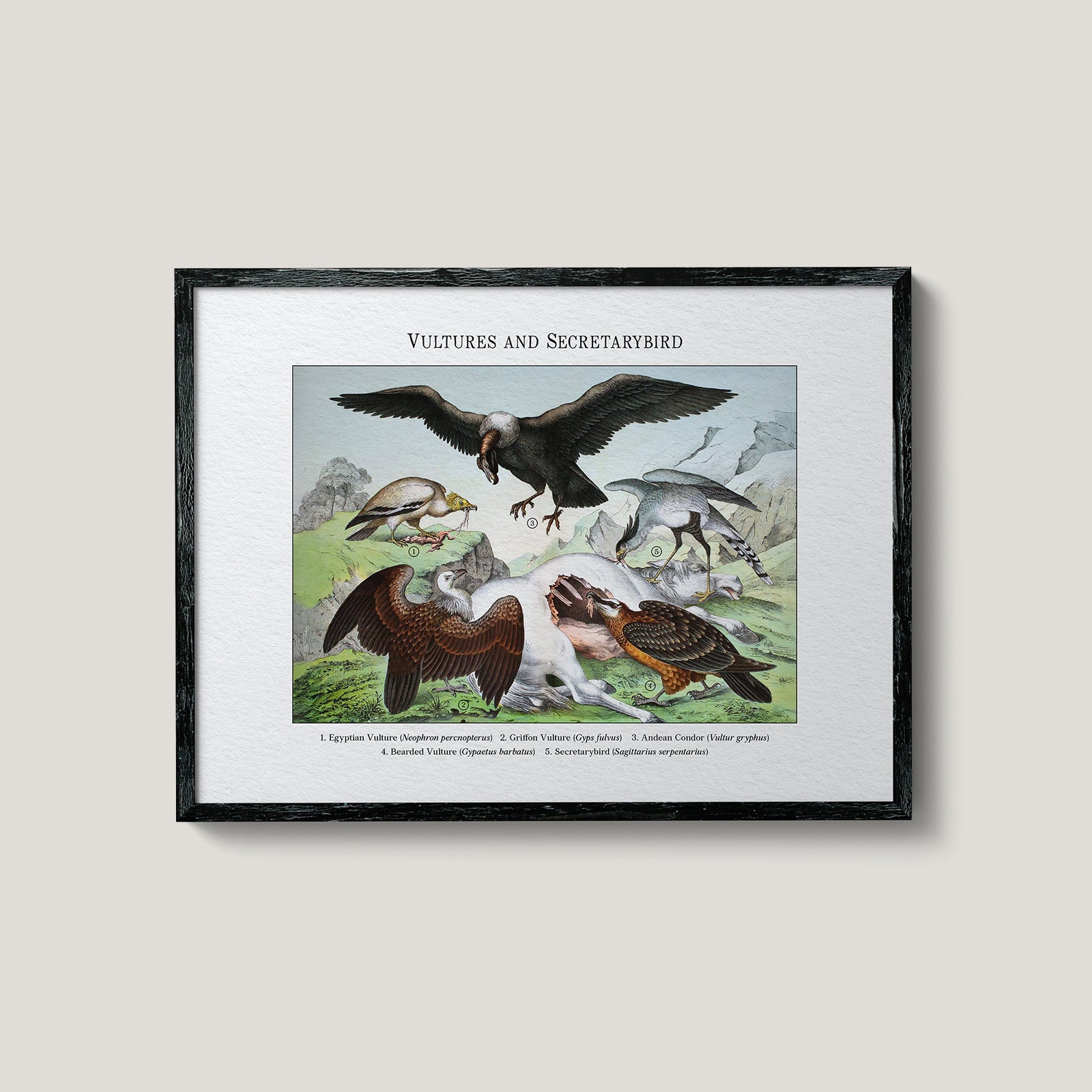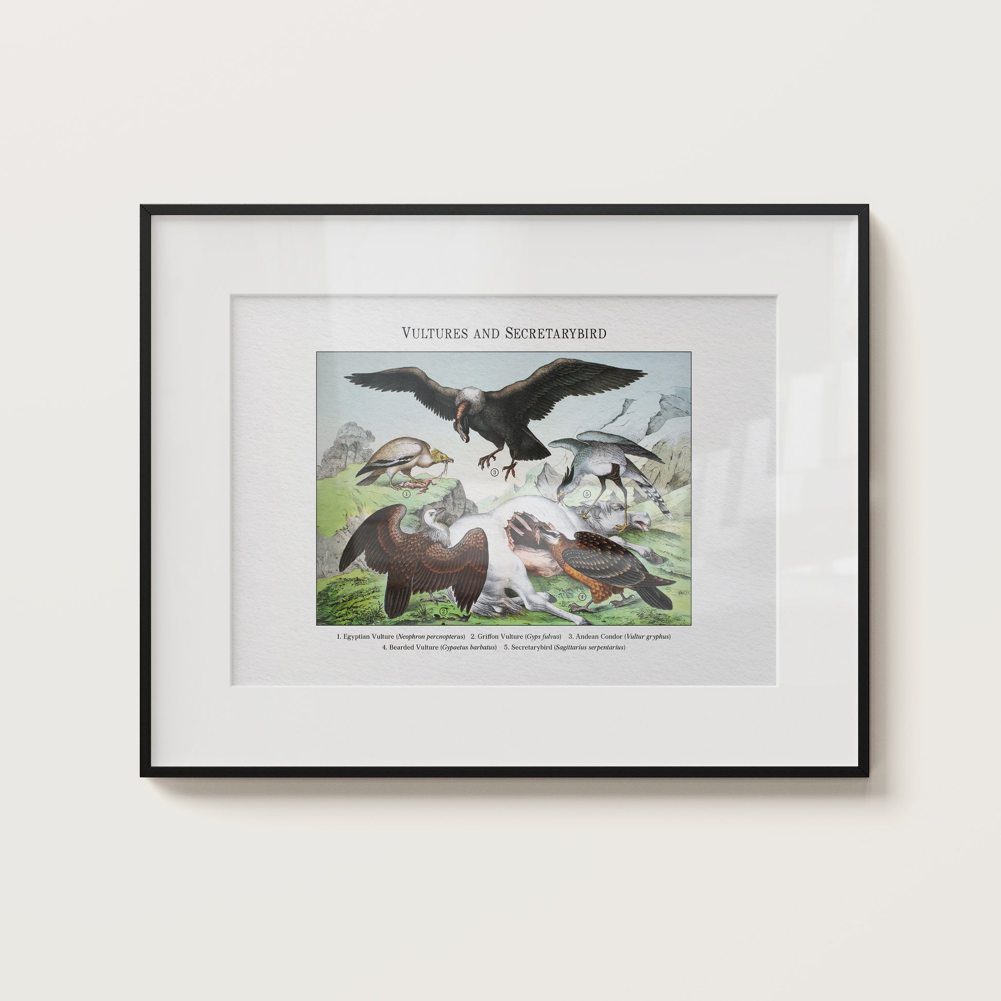 Restored from a 19th-century plate, this vintage scientific illustration gathers vultures and a secretarybird—the Egyptian Vulture (Neophron percnopterus), Griffon Vulture (Gyps fulvus), Andean Condor (Vultur gryphus), Bearded Vulture (Gypaetus barbatus), and Secretarybird (Sagittarius serpentarius)—arranged around a carcass on rocky uplands, with the condor descending and the secretarybird striding nearby. The restoration preserves period character while reviving fine linework and color, making it a striking natural history art print for study or display.