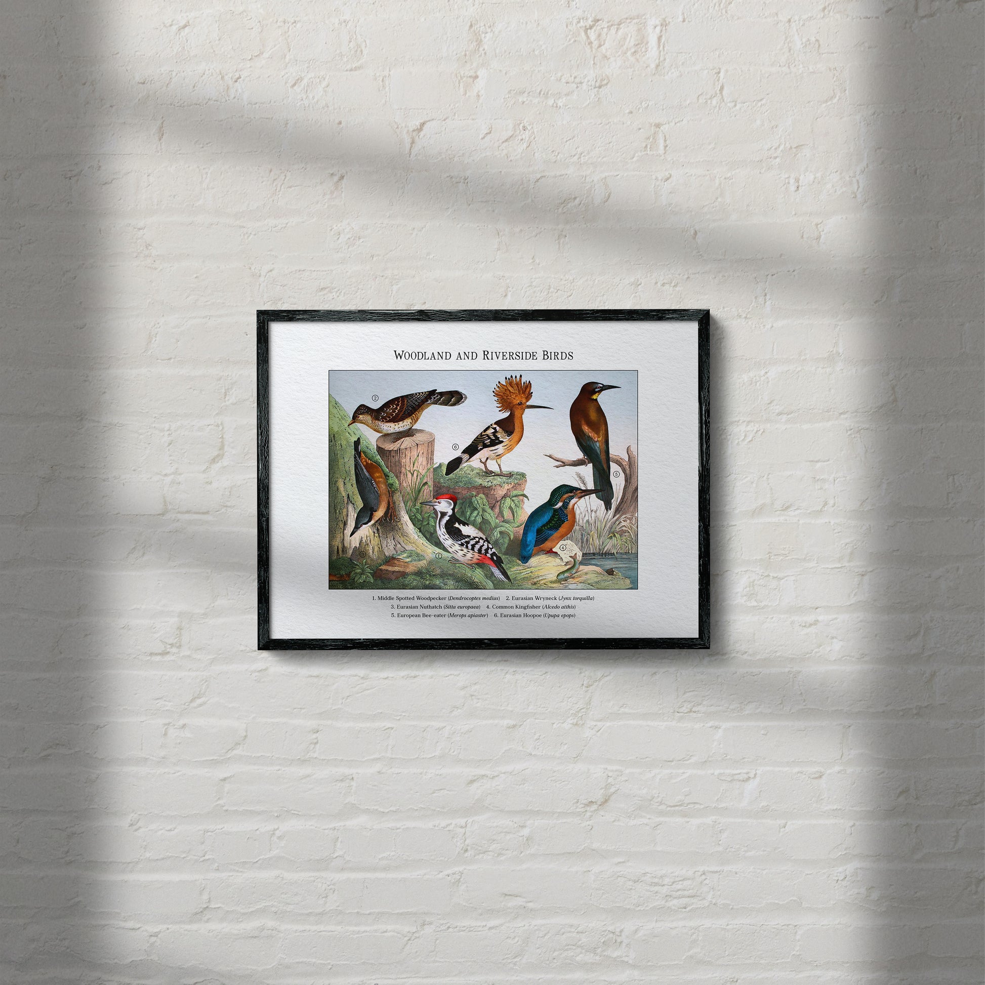 Restored from a 19th-century plate, this vintage scientific illustration gathers woodland and riverside birds—the Middle Spotted Woodpecker (Dendrocoptes medius), Eurasian Wryneck (Jynx torquilla), Eurasian Nuthatch (Sitta europaea), Common Kingfisher (Alcedo atthis), European Bee-eater (Merops apiaster), and Eurasian Hoopoe (Upupa epops)—arranged on trunks, stumps, and reeds beside a quiet stream. The restoration preserves period character while reviving fine linework and color, making it a striking natural history art print for study or display.